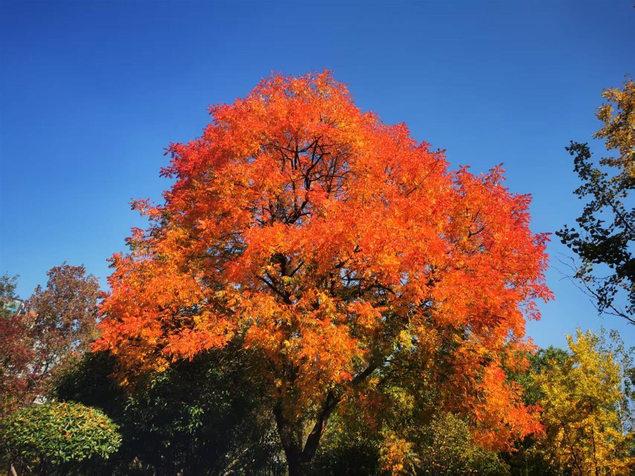 “黃連木比紅楓、烏桕等變色都要早。”該園品質服務部負責人張文華介紹,黃連木是無患子目、漆樹科、黃連木屬的落葉喬木,樹形高大,樹冠寬廣開闊,這棵樹有15米高,胸徑35-40厘米,30多年樹齡,每年秋天,它的變色就是深秋已至的信號,紅楓也紅火,但個頭小,一般在3-5米,各有各的風姿雅韻吧。
