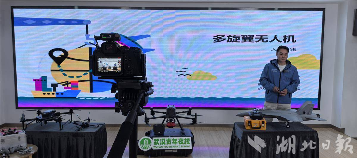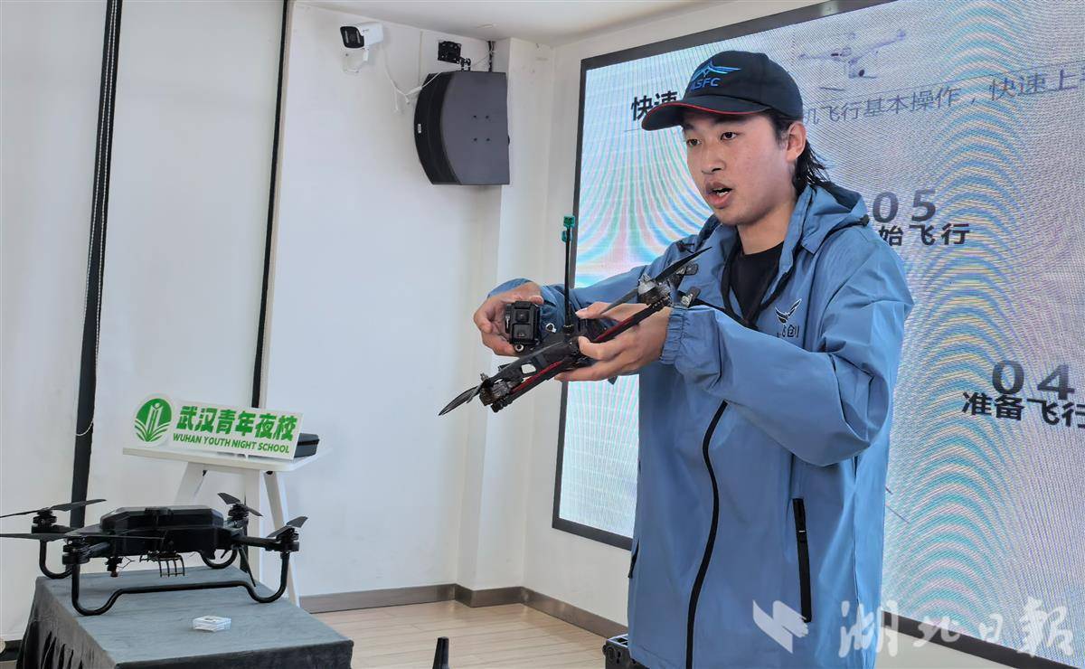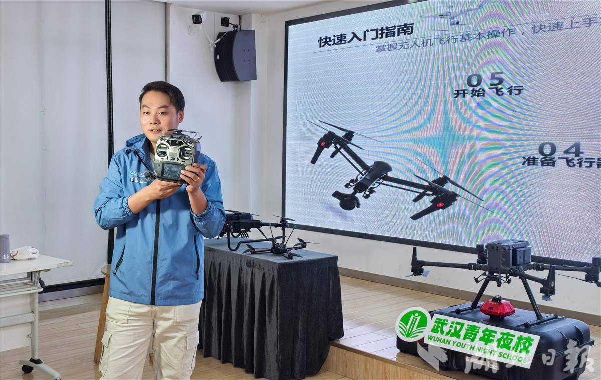 7日晚上7點(diǎn),武漢東湖高新區(qū)光谷青年之家教室里燈火通明。講臺(tái)上,一架架飛行器整齊擺放,教練呂浩正深入淺出地剖析其飛行奧秘;講臺(tái)下,30余位學(xué)員圍桌而坐,目光緊隨教練指尖。他們之中,有附近高校的學(xué)生、園區(qū)企業(yè)的職員,也不乏剛結(jié)束奔波、身著工裝前來“充電”的新就業(yè)群體。