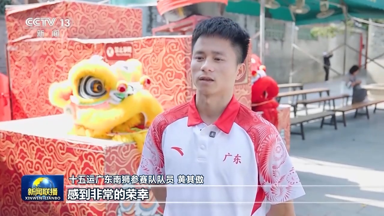 十五運廣東南獅參賽隊隊員 黃其傲:在廣東自家門口跟全國各地,還有來自港澳的朋友們一起以獅會友感到非常的榮幸。從小就喜歡舞龍舞獅項目,沒想到有一天舞龍舞獅也能登上全運會這個大舞臺,感到非常的激動,非常的開心。