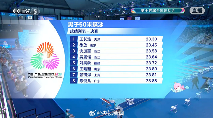 第十五屆全運會男子50米蝶泳決賽,王長浩代表天津隊出戰,以23秒30的成績奪得冠軍。點贊!