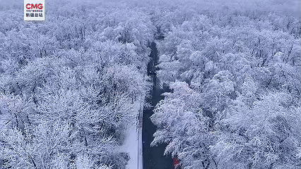 俯瞰太極島景區(qū),雪花簌簌穿過霧凇林,為每根枝條覆上毛絨“珊瑚絨”,林間小徑覆滿新雪,蜿蜒通向銀裝素裹的深處。