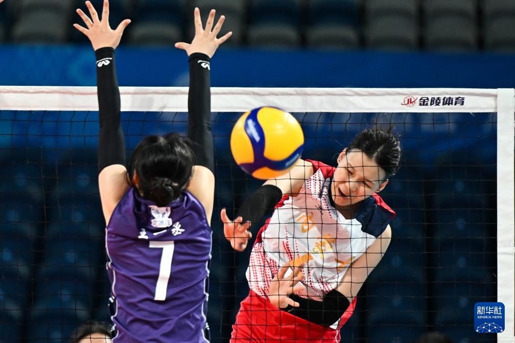 11月11日,北京隊球員趙容慧(右)在比賽中扣球。