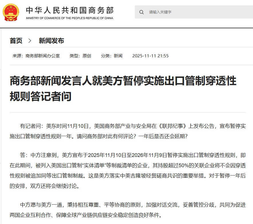 答:中方注意到,美方宣布于2025年11月10日至2026年11月9日暫停實施出口管制穿透性規(guī)則,即在此期間,被列入美國出口管制“實體清單”等制裁清單的企業(yè),其持股超過50%的關(guān)聯(lián)企業(yè)將不會因穿透性規(guī)則被追加同等出口管制制裁。這是美方落實中美吉隆坡經(jīng)貿(mào)磋商共識的重要舉措。對于暫停一年后的安排,雙方還將會繼續(xù)討論。