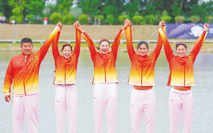男子項目頒獎的同時,女子四人單槳決賽鳴槍。“沖啊!”男隊員們齊聲助威。四位巾幗一馬當先,她們槳頻穩定,力量十足,逐漸將對手甩開,最終以絕對優勢穩穩奪金。