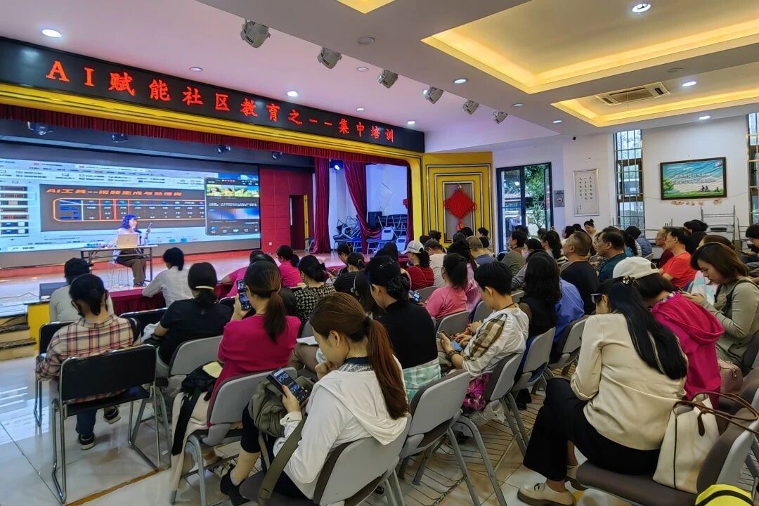 面對居民“有想法,難表達;有關切,難建言”的普遍困境,2025年3月,街道在全區率先申報“AI賦能社區教育”特色項目,系統化開設“AI鄰里學堂”。通過分層培訓建立賦能體系,率先培養講師團掌握AI工具以創新教學,進而選拔30名骨干學員學習運用AI形成文案、視頻及治理提案。這些“火種學員”結業后,持續為超過300人次的社區居民提供免費培訓,并通過“以點帶面”的方式輻射帶動不少于600人參與學習與實踐,構建“師訓先行、骨干帶動、全民輻射”的三級賦能機制。