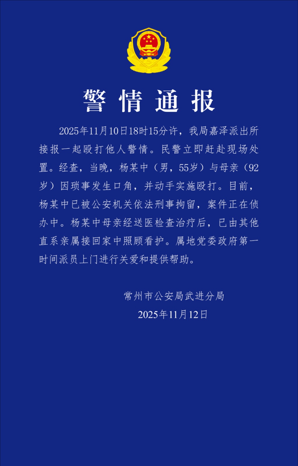 今天,江蘇常州警方就“男子毆打92歲母親”發布警情通報,詳情如下: