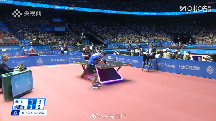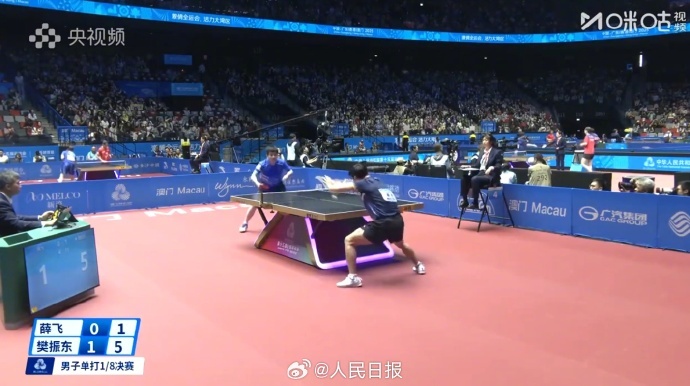 12日,第十五屆全國運動會乒乓球項目在澳門銀河綜藝館繼續進行,在剛剛結束的一場男單1/8決賽中,上海隊的樊振東戰勝湖北隊的薛飛,晉級男單八強。