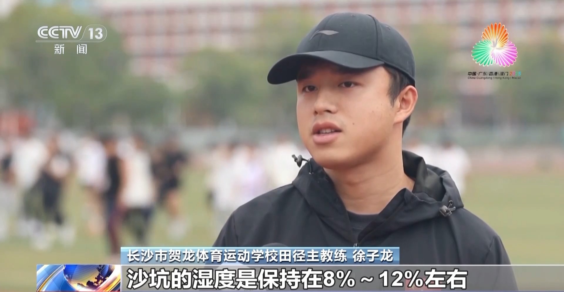 長沙市賀龍體育運動學校田徑主教練 徐子龍:沙坑的濕度保持在8%~12%左右。如果沙坑濕度較高,它就會像水泥一樣板硬,對運動員是一種傷害。
