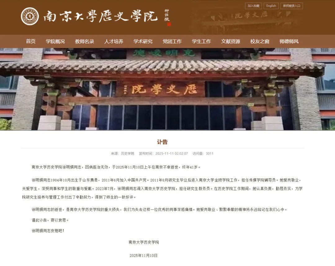 南京大學歷史學院徐明娟同志,因病醫(yī)治無效,于2025年11月10日上午在南京不幸逝世,終年41歲。