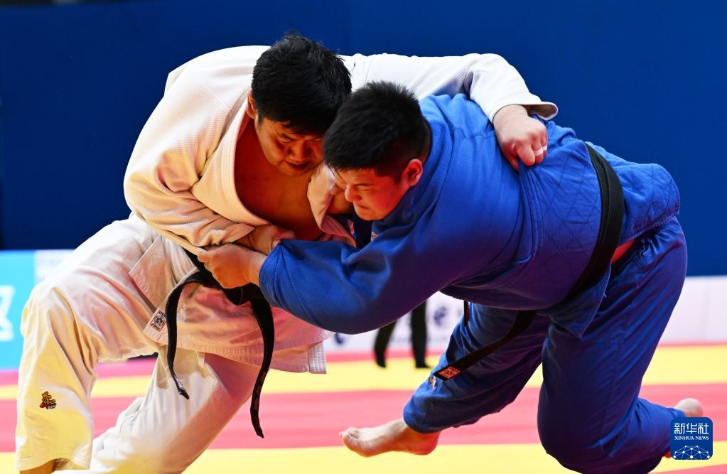 11月12日,山東隊選手原紹童(左)與煤礦體協隊選手林棟在男子100公斤以上級四分之一決賽中。最終,原紹童獲勝,晉級下一輪。