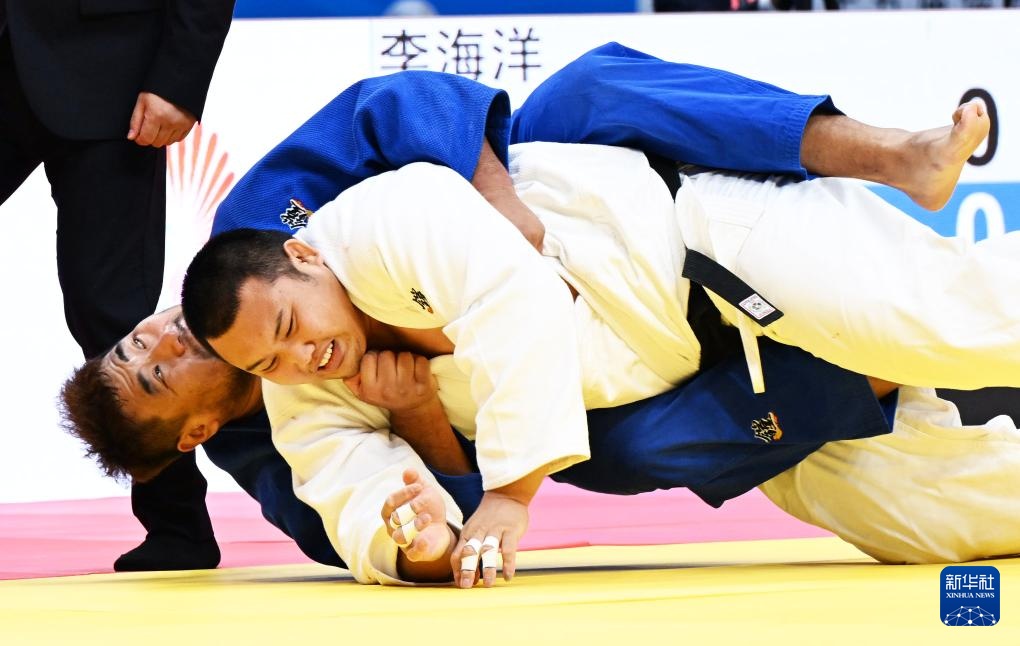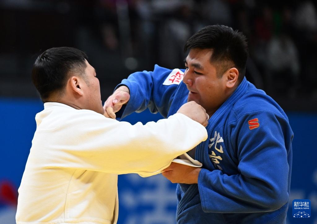 11月12日,北京隊選手阿熱曼江·阿迪力(右)與天津隊選手李瑞軒在男子100公斤以上級四分之一決賽中。最終,阿熱曼江·阿迪力獲勝,晉級下一輪。