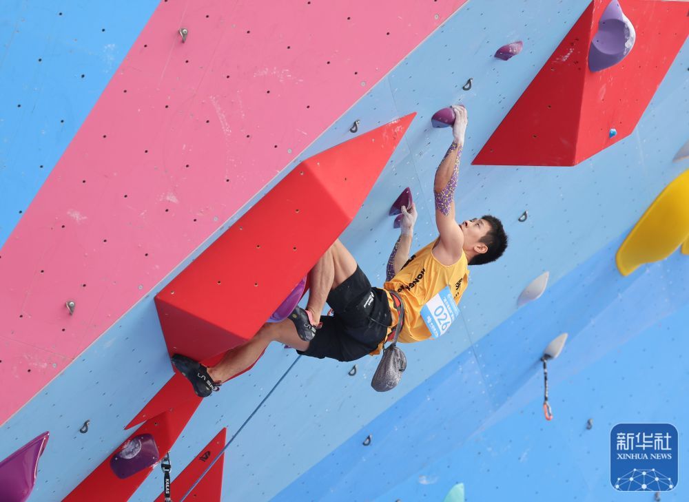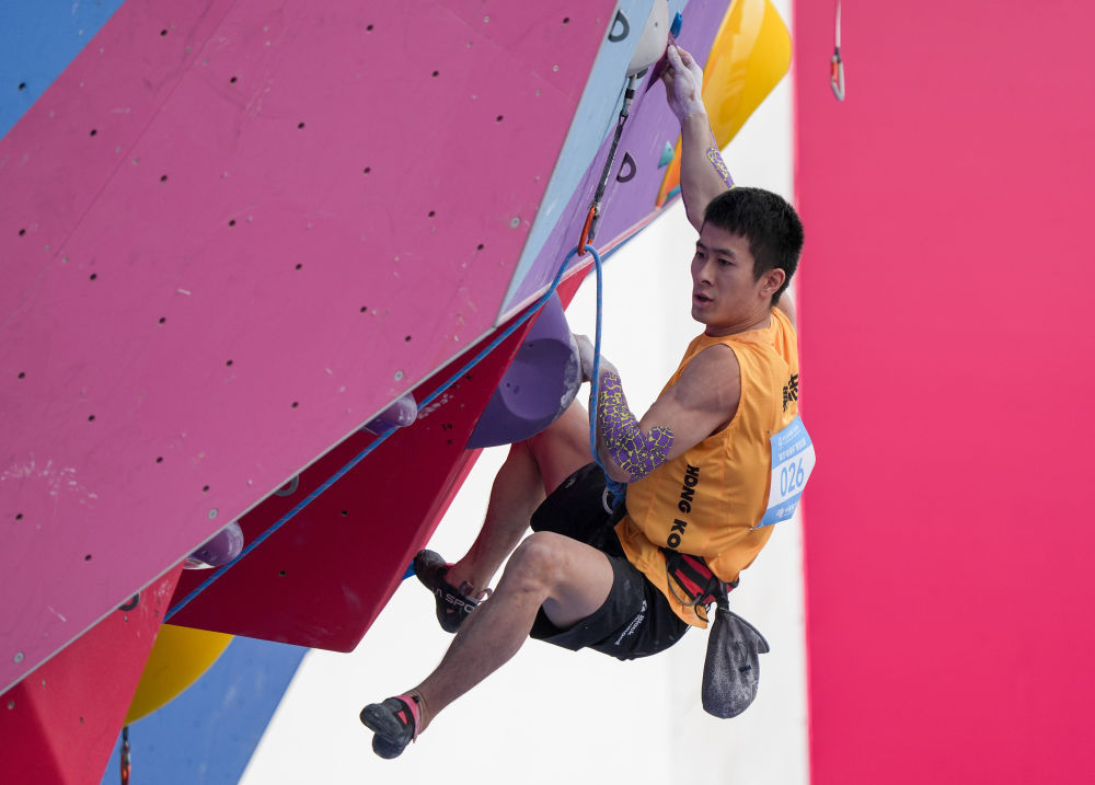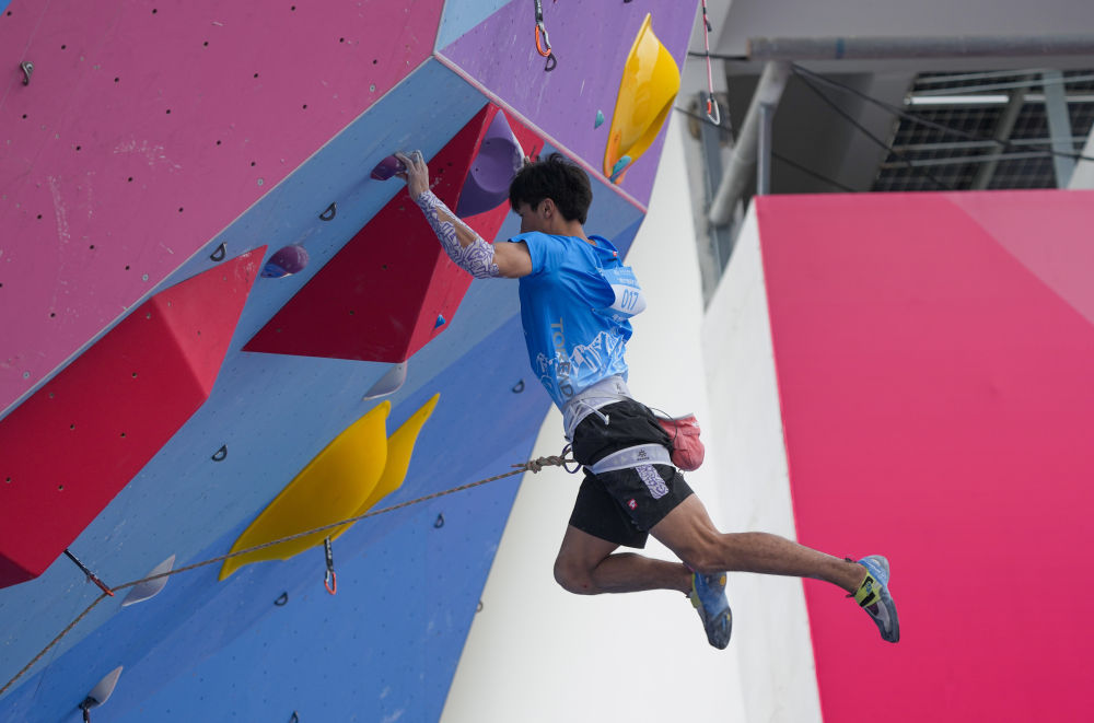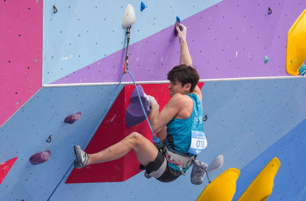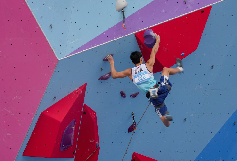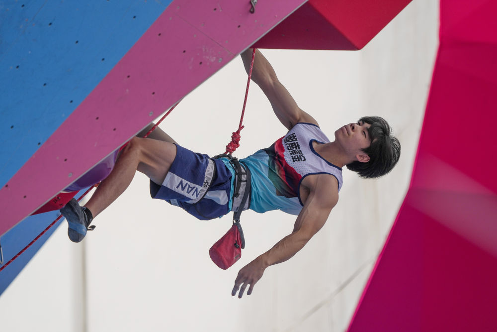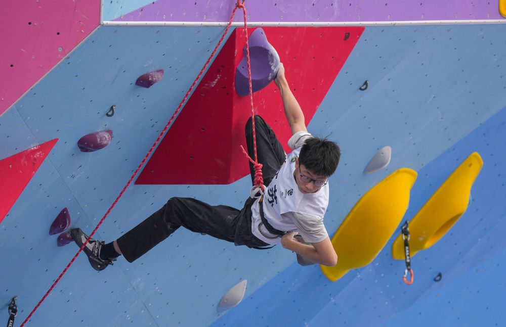 11月12日,第十五屆全國運動會攀巖項目男子難度預賽在廣州舉行。
