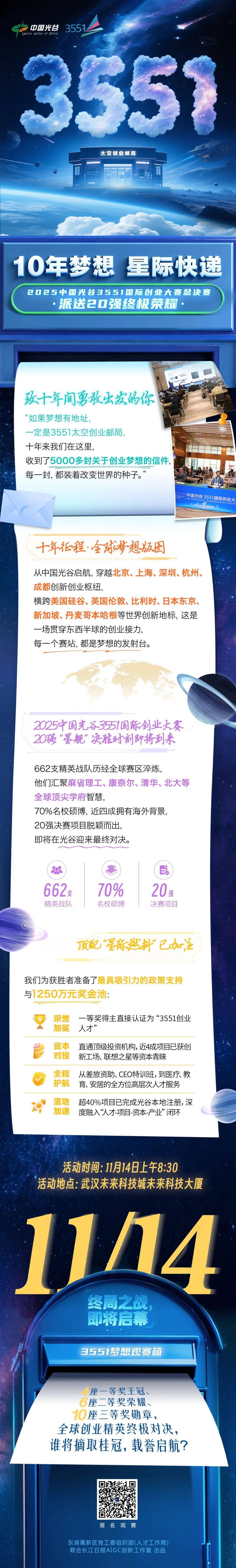 湖北日報訊(通訊員東新才)11月14日上午8:30,2025中國光谷3551國際創業大賽總決賽即將在武漢未來科技城未來科技大廈二樓多功能廳舉行。來自麻省理工、康奈爾、清華、北大等全球知名學府的優秀創業者,將在大賽的舞臺上追光逐夢。