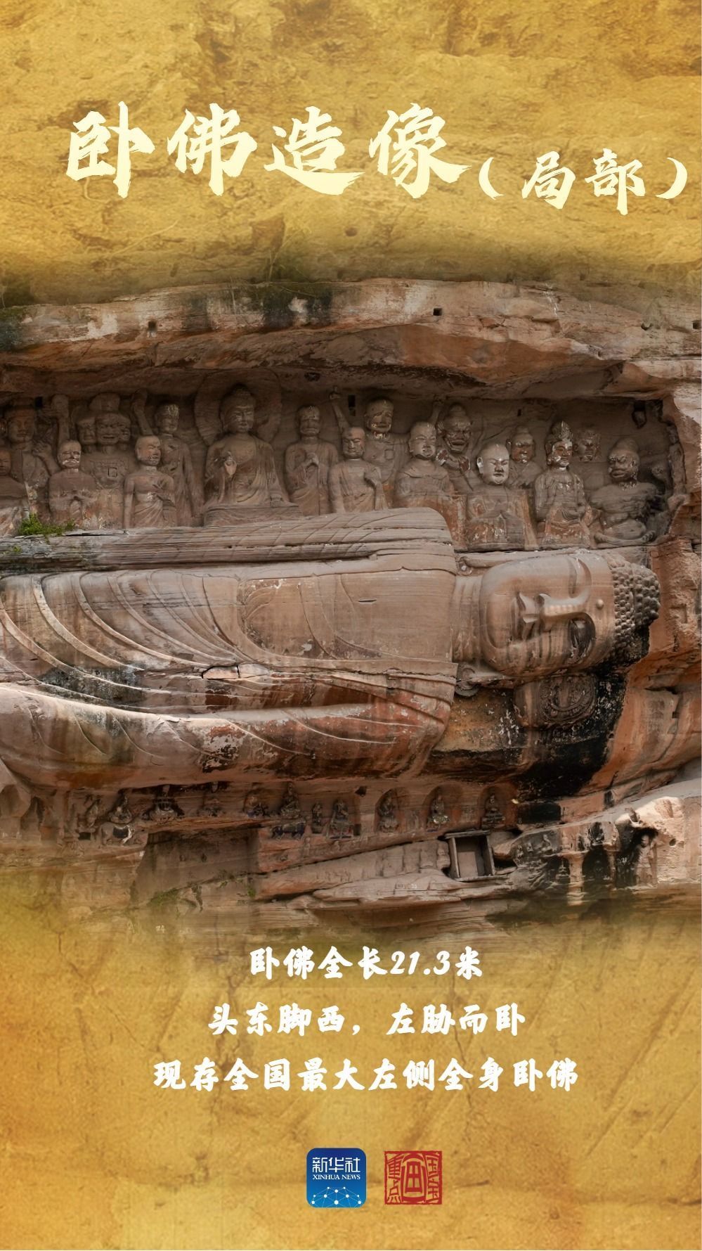 臥佛龕的造像依山取勢、大膽創新,由三組構成:上面一組為釋迦牟尼涅槃前的說法圖,中間一組為釋迦牟尼左側臥佛造像,下面一組為善財童子五十三參造像。