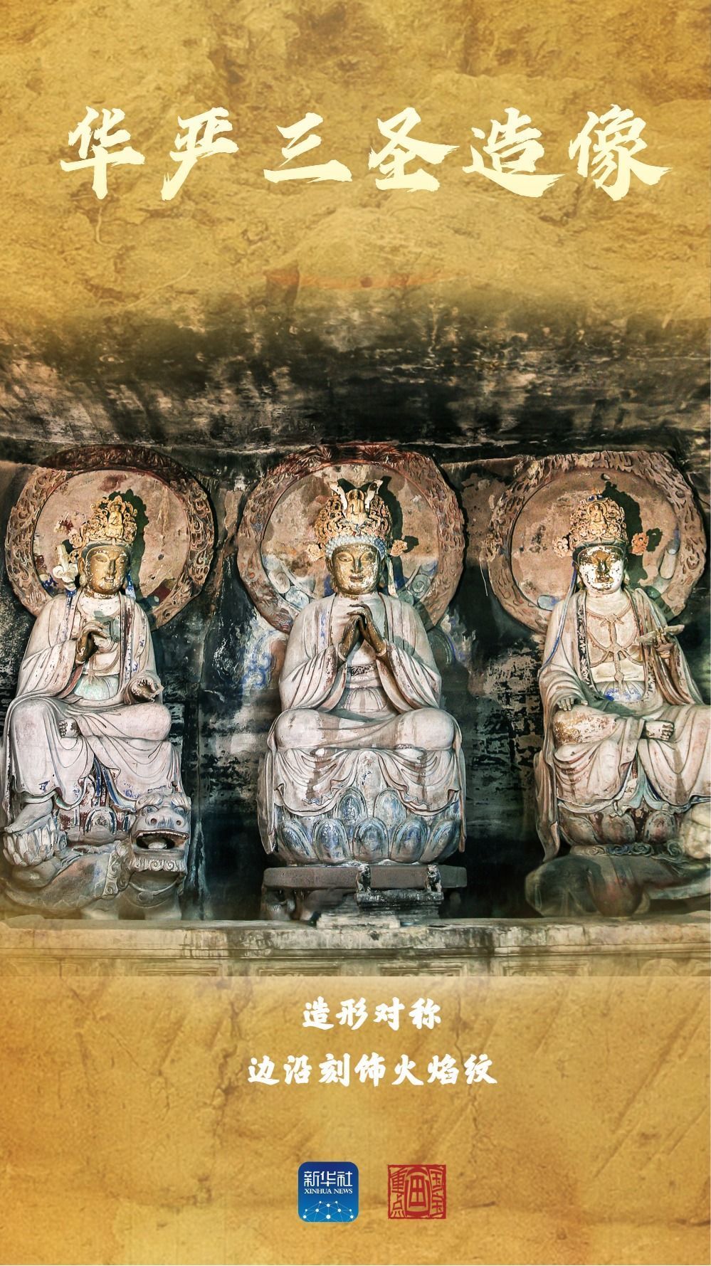 “華嚴三圣”三尊佛像高為5.2米,中為毗盧遮那佛,左右分別為普賢菩薩與文殊菩薩,結跏趺坐于白象、青獅背上。左右側壁各刻有通高4.1米的菩薩各五身,壁上方刻有善財童子五十三參圖,壁前端各刻有一只下山吼。全窟構思巧妙、布局嚴謹、動靜結合,堪稱石刻藝術精品。