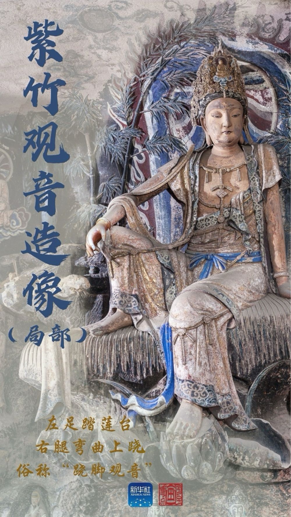 紫竹觀音造像位于第五批全國重點文物保護單位毗盧洞內。該洞石刻造像主要開鑿于宋代,后經歷代修繕補刻。這尊觀音像高3米,懸坐于3米長的弧形荷葉上,頭戴鏤空花冠,彩帶飄逸,上身微左側,左手撫撐葉面,右手呈“蘭花手”放于膝上,赤腳。與常見的直立、端坐的觀音造像不同,這尊雕像姿態悠然、神情自若,其瀟灑之態仿佛在與千年后的游客對話。