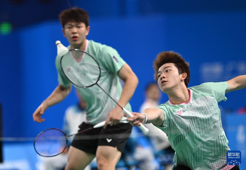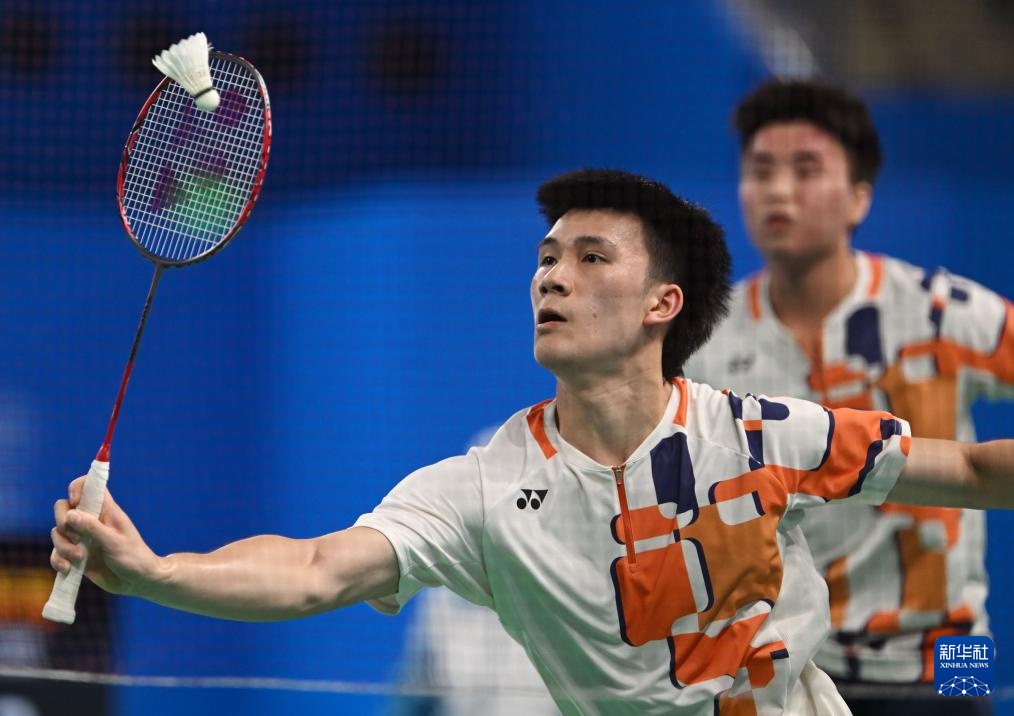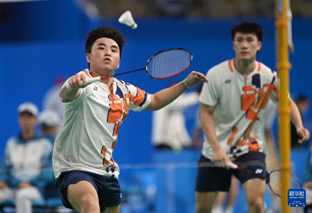 11月12日,上海隊組合胡珂源(右)/朱一珺在男雙比賽中回球。最終,他們2比1戰勝香港隊組合洪魁駿/呂俊瑋。