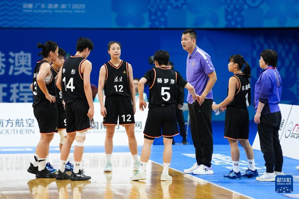 11月12日,福建隊主教練龔松林(右三)在比賽間隙布置戰術。