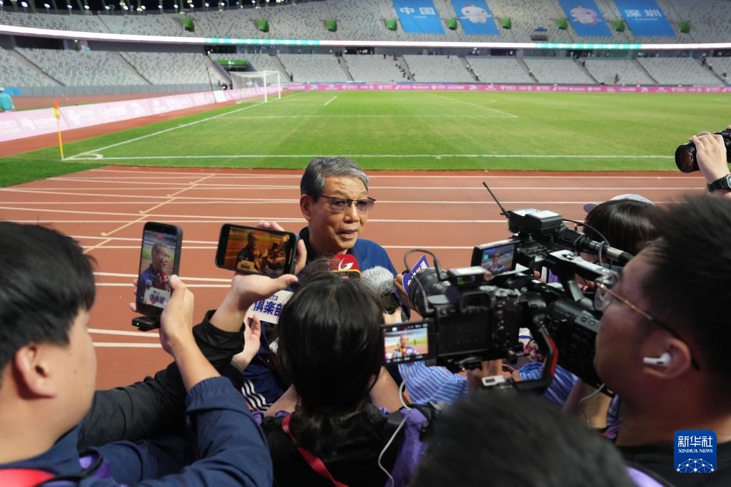 11月12日,上海隊總教練徐根寶(中)在賽后接受采訪。