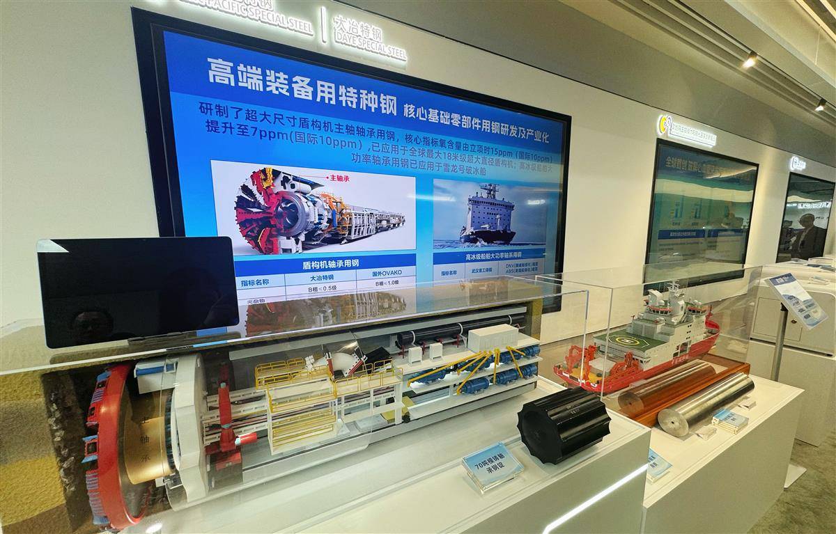 11月5日,“尖刀”技術攻關項目成果展上,由大冶特鋼研制的、應用于全球最大18米級盾構機的特種鋼,作為“高端裝備”與“先進材料”領域的交叉典范,尤為引人注目。該成果突破國外壟斷,依托特種鋼研制出的全球最大盾構機主軸承,連創三項世界紀錄:直徑8.61米,全球最大;?單體62噸,全球最重;軸向承載力10萬千牛、全球最高?;解決了我國高端裝備“卡脖子”難題,支撐國家重大基建自主可控。