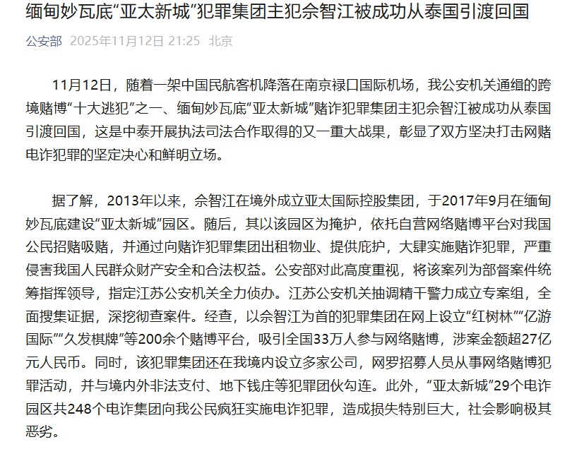 據了解,2013年以來,佘智江在境外成立亞太國際控股集團,于2017年9月在緬甸妙瓦底建設“亞太新城”園區。隨后,其以該園區為掩護,依托自營網絡賭博平臺對我國公民招賭吸賭,并通過向賭詐犯罪集團出租物業、提供庇護,大肆實施賭詐犯罪,嚴重侵害我國人民群眾財產安全和合法權益。公安部對此高度重視,將該案列為部督案件統籌指揮領導,指定江蘇公安機關全力偵辦。江蘇公安機關抽調精干警力成立專案組,全面搜集證據,深挖徹查案件。經查,以佘智江為首的犯罪集團在網上設立“紅樹林”“億游國際”“久發棋牌”等200余個賭博平臺,吸引全國33萬人參與網絡賭博,涉案金額超27億元人民幣。同時,該犯罪集團還在我境內設立多家公司,網羅招募人員從事網絡賭博犯罪活動,并與境內外非法支付、地下錢莊等犯罪團伙勾連。此外,“亞太新城”29個電詐園區共248個電詐集團向我公民瘋狂實施電詐犯罪,造成損失特別巨大,社會影響極其惡劣。