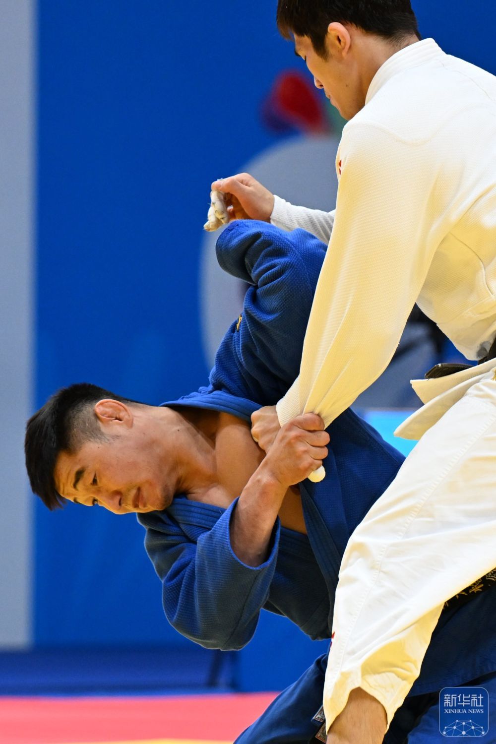 ↑ 內蒙古隊選手布和畢力格(左)和上海隊選手謝亞東在男子90公斤級金牌賽中。最終,布和畢力格戰勝謝亞東奪得金牌。