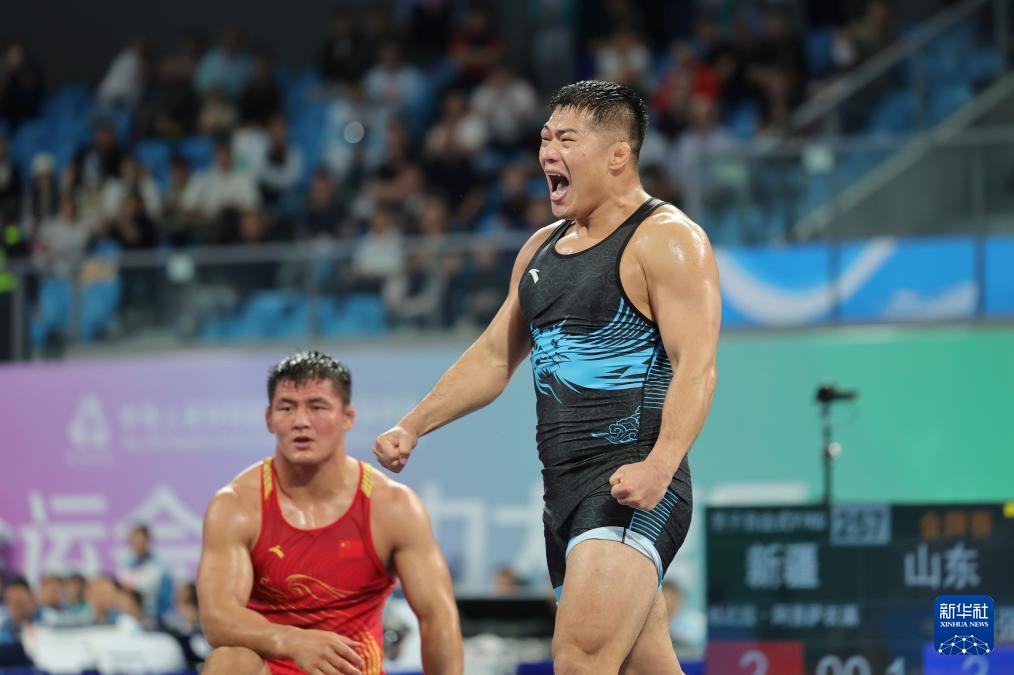 11月12日,山東隊選手楊超強(qiáng)(左)與新疆隊選手哈比拉·阿吾薩衣滿在決賽中。最終,楊超強(qiáng)獲得冠軍。