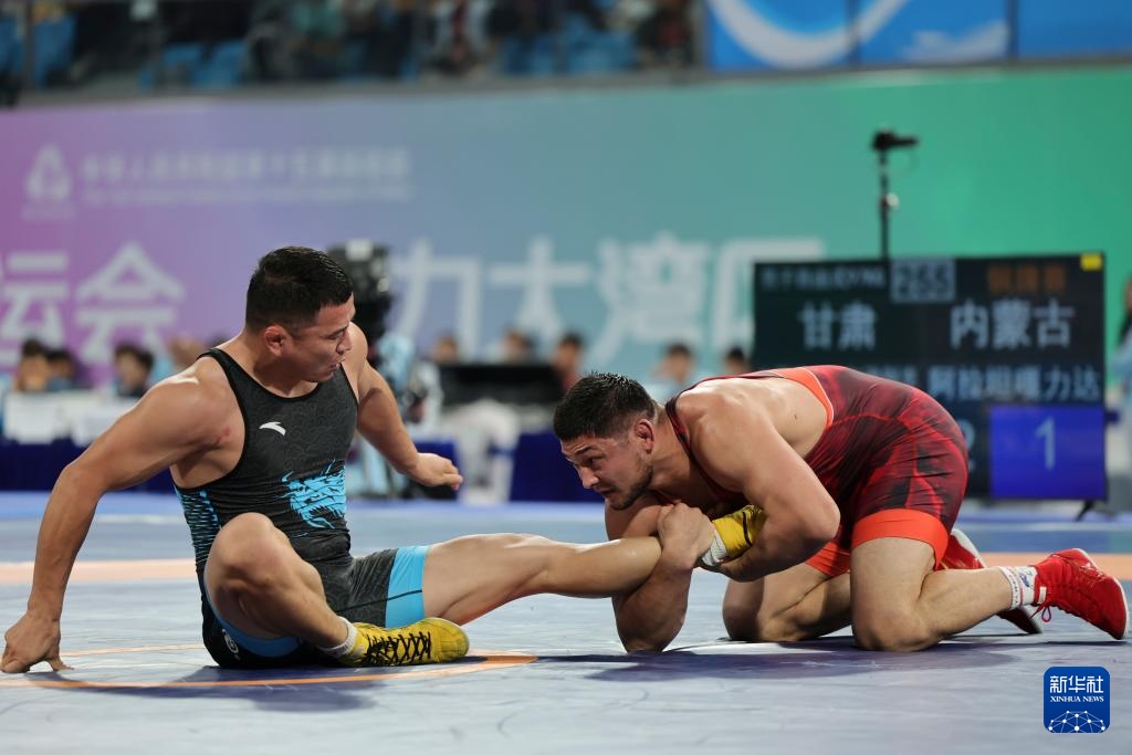 11月12日,甘肅隊選手木黑特·吐爾遜別克(右)與內(nèi)蒙古隊選手阿拉坦嘎力達(dá)在銅牌賽中。最終,木黑特·吐爾遜別克獲得季軍。
