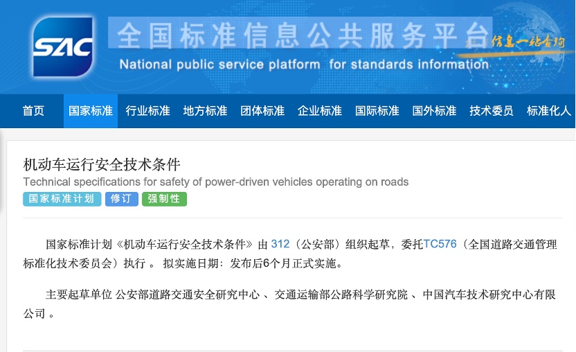 11月12日,據(jù)全國標準信息公共服務平臺官網(wǎng),公安部組織起草的國家標準計劃《機動車運行安全技術條件》向社會征求意見。該標準主要起草單位有公安部道路交通安全研究中心、交通運輸部公路科學研究院、中國汽車技術研究中心有限公司,擬在征求意見稿發(fā)布后6個月正式實施,替代現(xiàn)行的GB 7258。