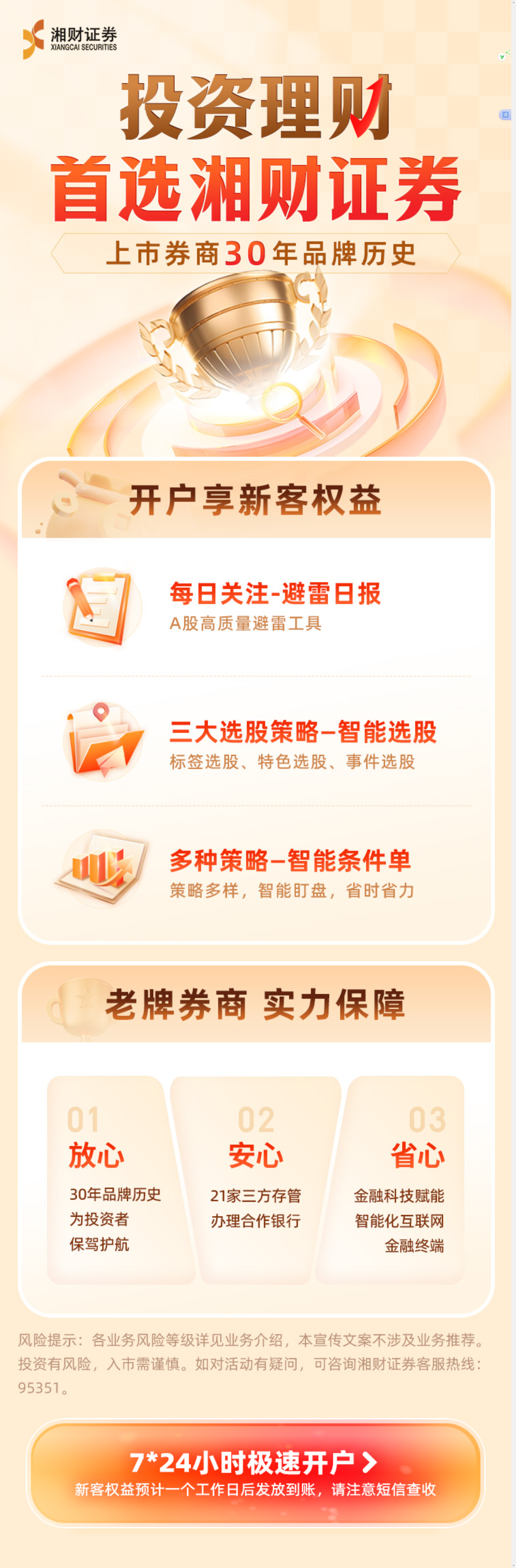 風險提示:各業務風險等級詳見業務介紹,本宣傳文案不涉及業務推薦。投資有風險,如是需謹慎。如對活動有疑問,可咨詢湘財證券客服熱線:95353。