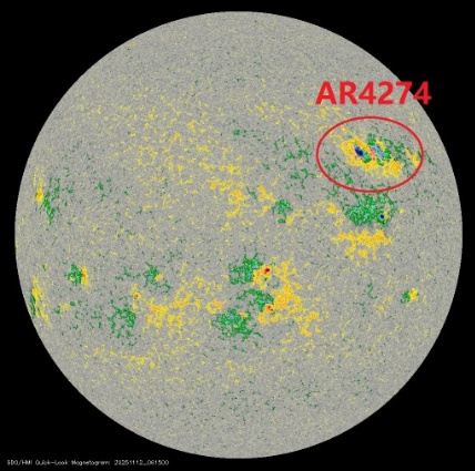 這次特大地磁暴事件的源頭均來自太陽活動區AR4274。該活動區在11月9、10、11日分別爆發了X1.7級、X1.2級、X5.1級耀斑,都伴隨有強烈的日冕物質拋射。