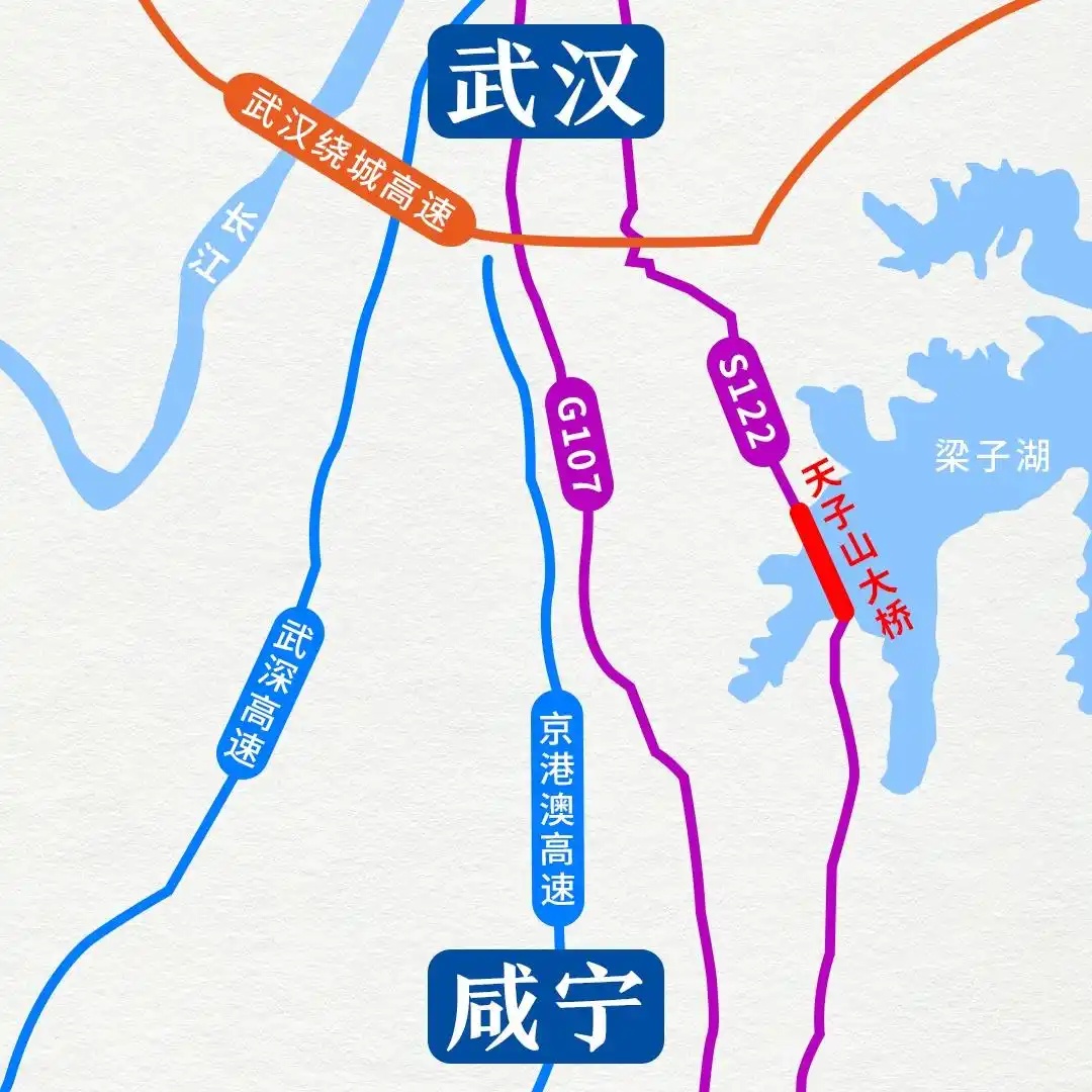 天子山大橋建成后,將S122公路兩岸連接,梁子湖南北兩岸居民通行時間將由原本繞行1個小時,縮短至2分鐘直達。同時咸寧至武漢車程也將縮短至1小時左右。