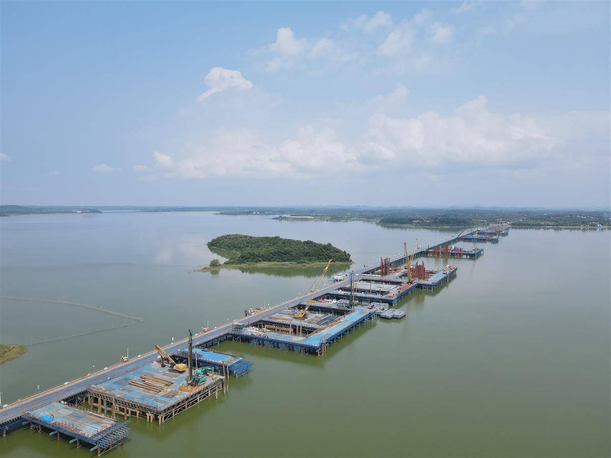 11月12日,武漢,梁子湖水光瀲滟。湖面之上,天子山大橋項目施工熱火朝天:塔吊林立,機器轟鳴,工程車輛往來穿梭,工人們在作業面上緊張施工,一派繁忙景象。