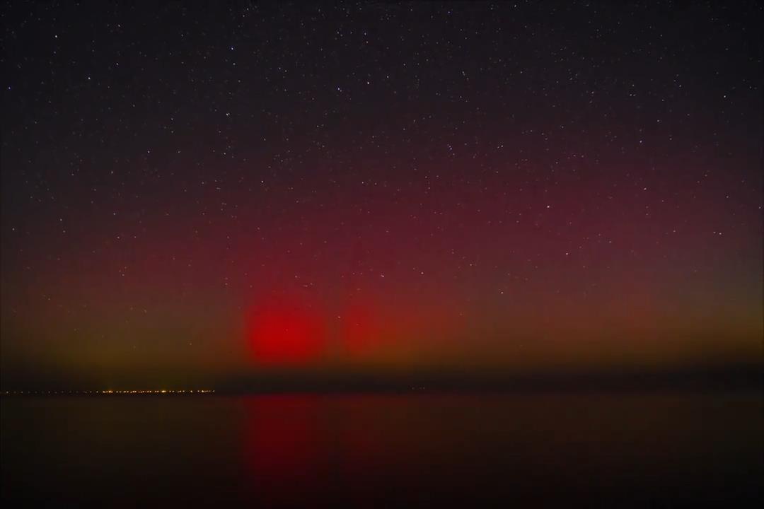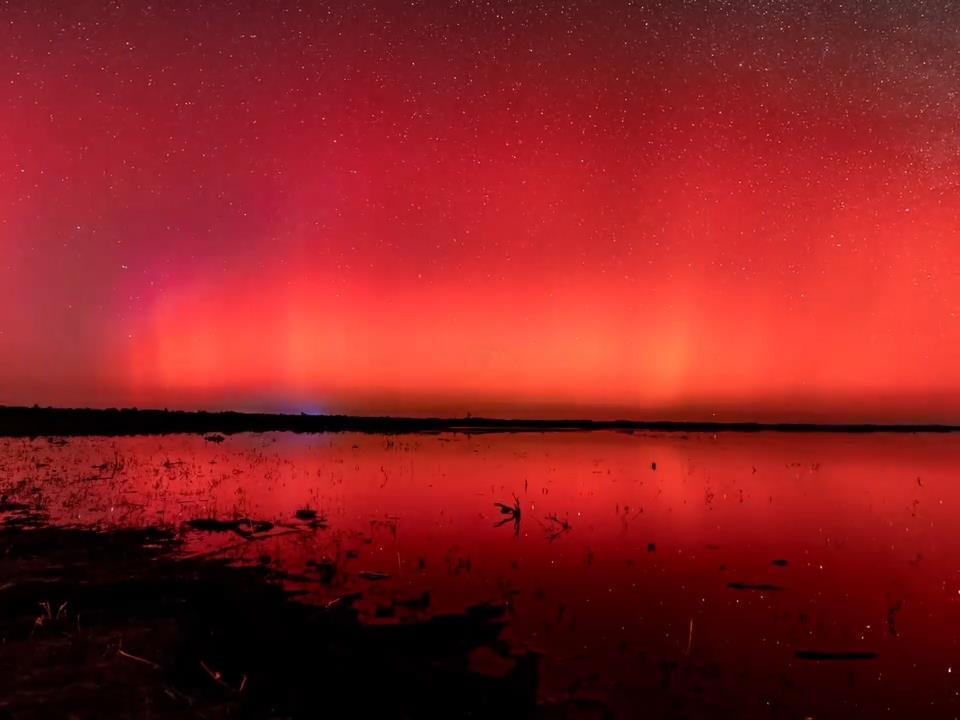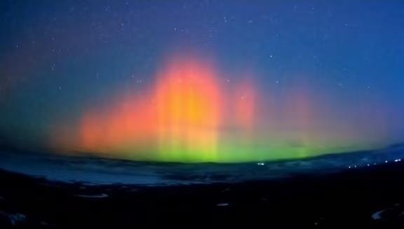 視頻畫面顯示,在黑龍江省鶴崗市鶴立湖、大慶市郊區、哈爾濱市泥河水庫和大興安嶺地區加格達奇區等多地夜空中出現了絢麗的紅色極光;在內蒙古自治區呼倫貝爾市額爾古納,天空中的極光在靠近地面的區域顯示為綠色,遠離地面的區域卻是橘紅色,從遠處看仿佛一條紅綠漸變的絲帶飄浮在夜空中;新疆烏魯木齊郊區的極光顏色則是更為純粹的紅色,極光倒映在水中將天地都染成了紅色。