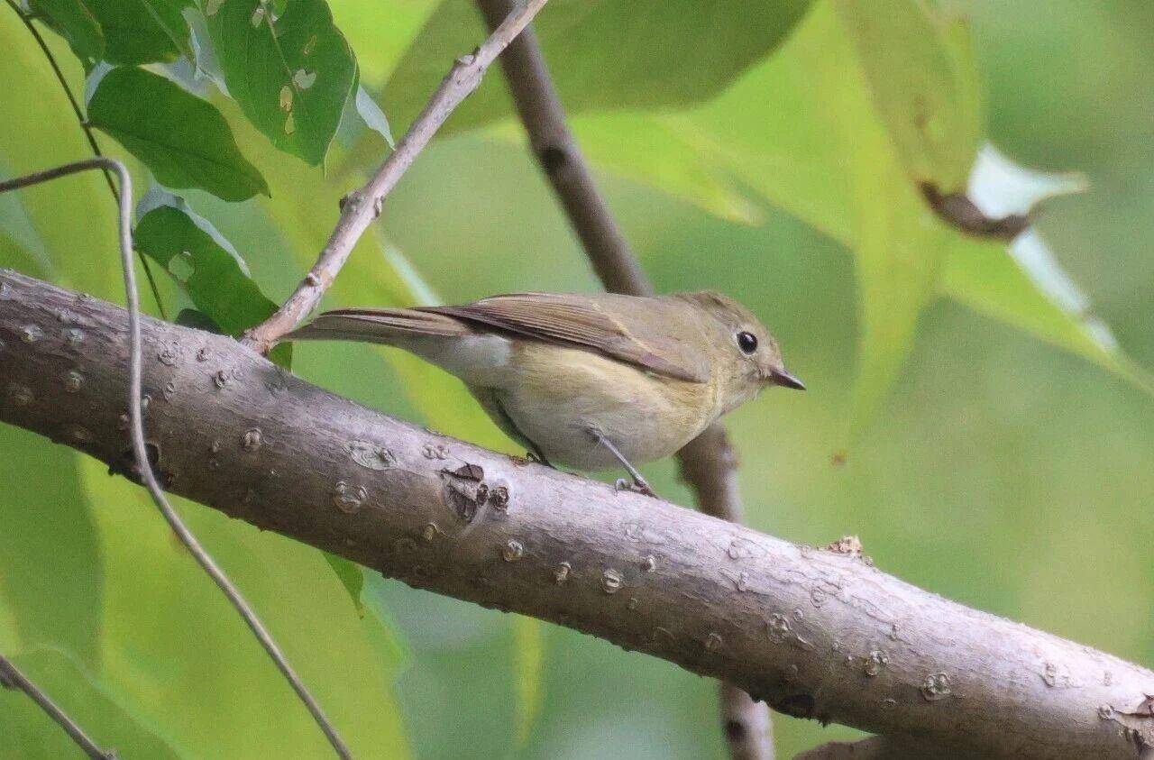 銹胸藍姬鹟為安靜的樹棲性鹟,體型較小,通常在森林的中下層活動。通過拍攝的照片可見,此次記錄的銹胸藍姬鹟為雌鳥,體色較暗淡,上體橄欖褐色,下體淺灰褐色。有明顯的淺色眼圈,眼線較淺。翼上覆羽有一道淺色翼斑,尾羽基部沒有白色。喙較短,上下喙均為黑色。