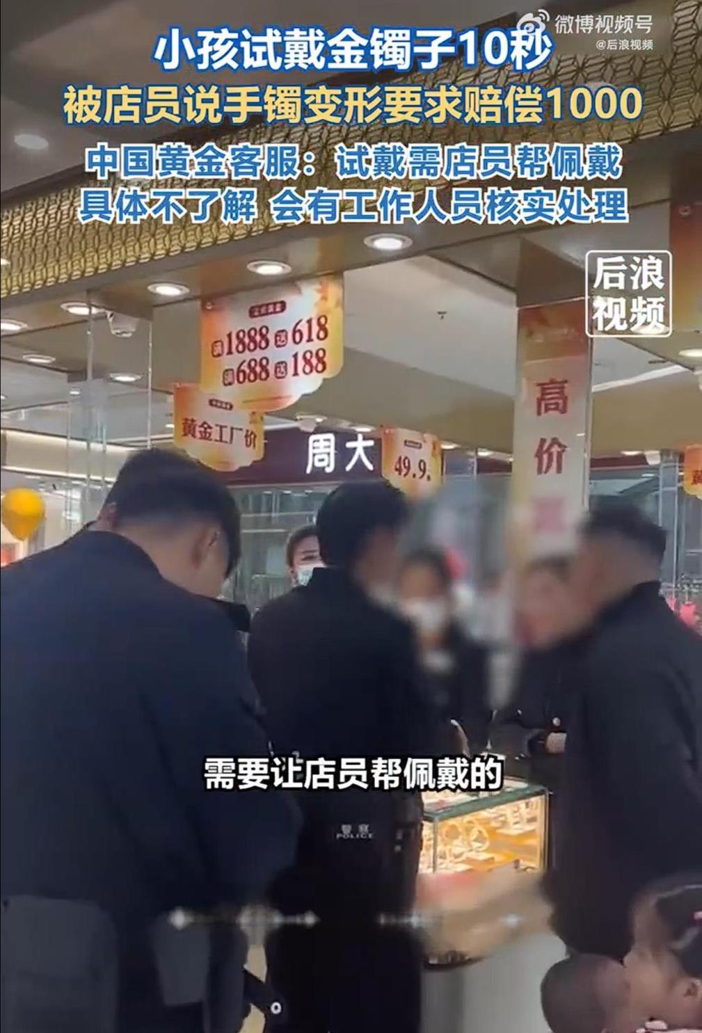 11月12日,據(jù)媒體報(bào)道,女子帶孩子逛金店時(shí),在營業(yè)員全程注視下試戴了一個(gè)黃金手鐲,全程不超過10秒,取下來時(shí)營業(yè)員說手鐲變形要求賠償1000元,否則不讓她們走。該女子表示,手鐲太大,甚至都沒怎么碰到孩子的皮膚,當(dāng)?shù)孛窬綀龊笠舱J(rèn)為營業(yè)員的做法“可笑”。11月13日,中國黃金客服表示,店員都是有經(jīng)過培訓(xùn)的,試戴需要店員幫忙佩戴,對于此事客服部不了解具體情況,具體會有工作人員核實(shí)處理。(據(jù)11月13日九派新聞)