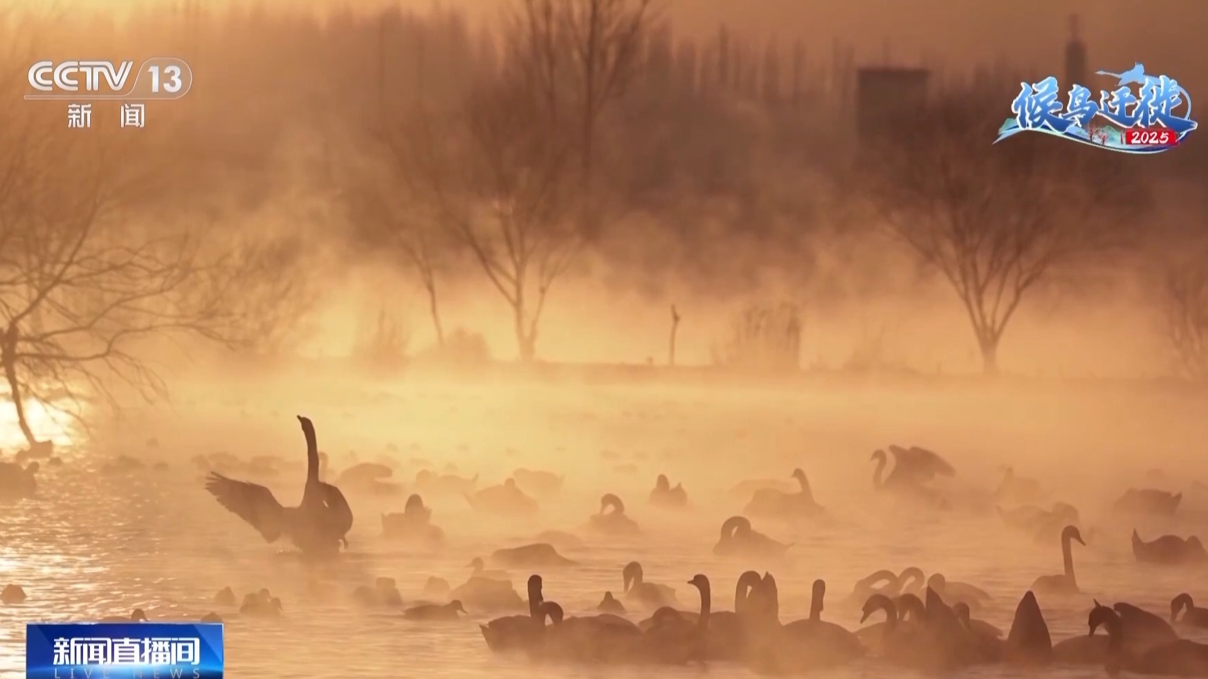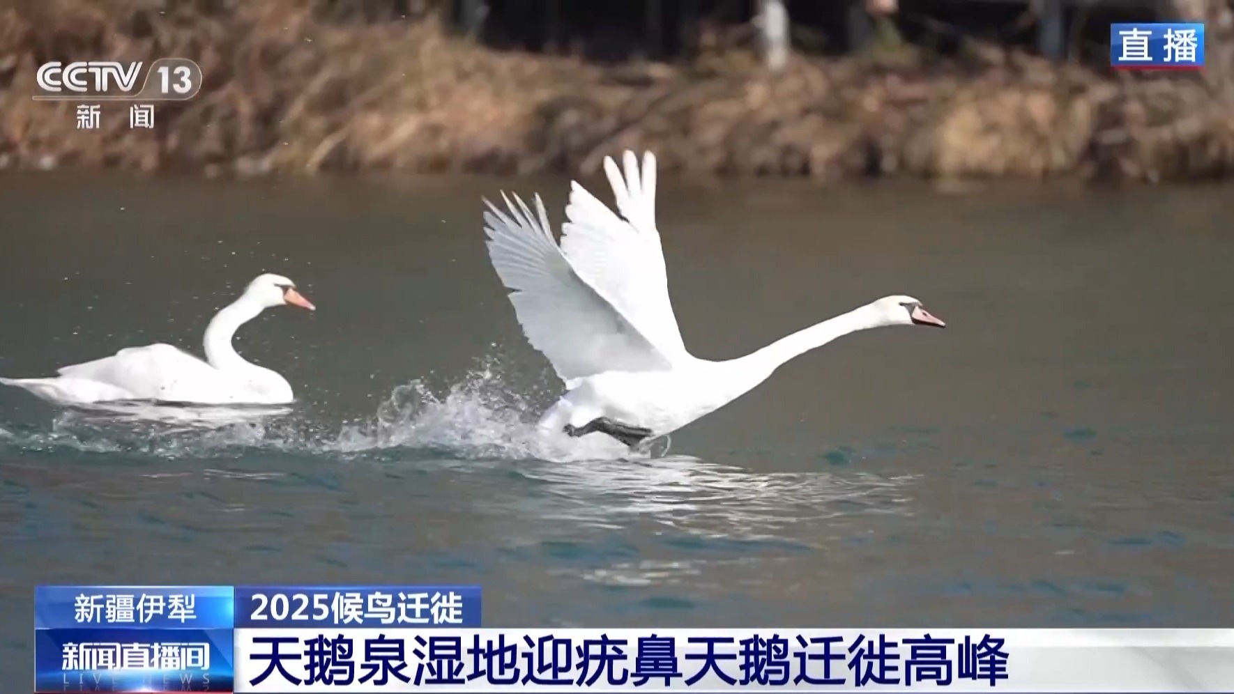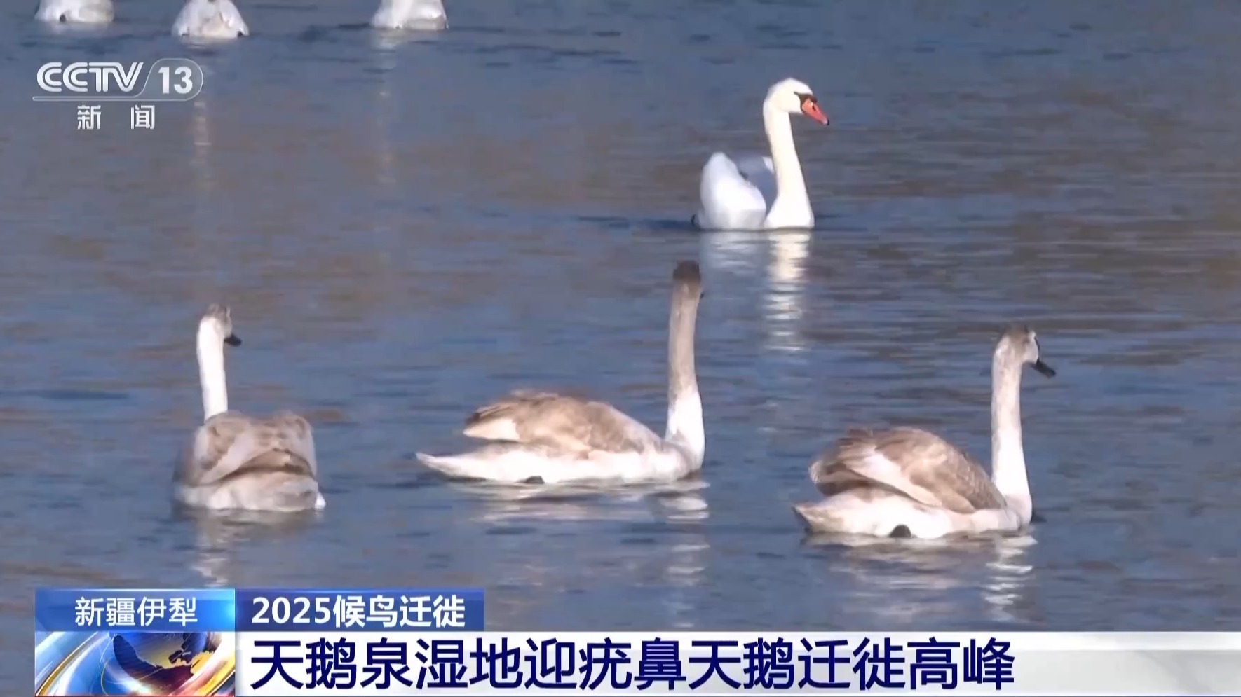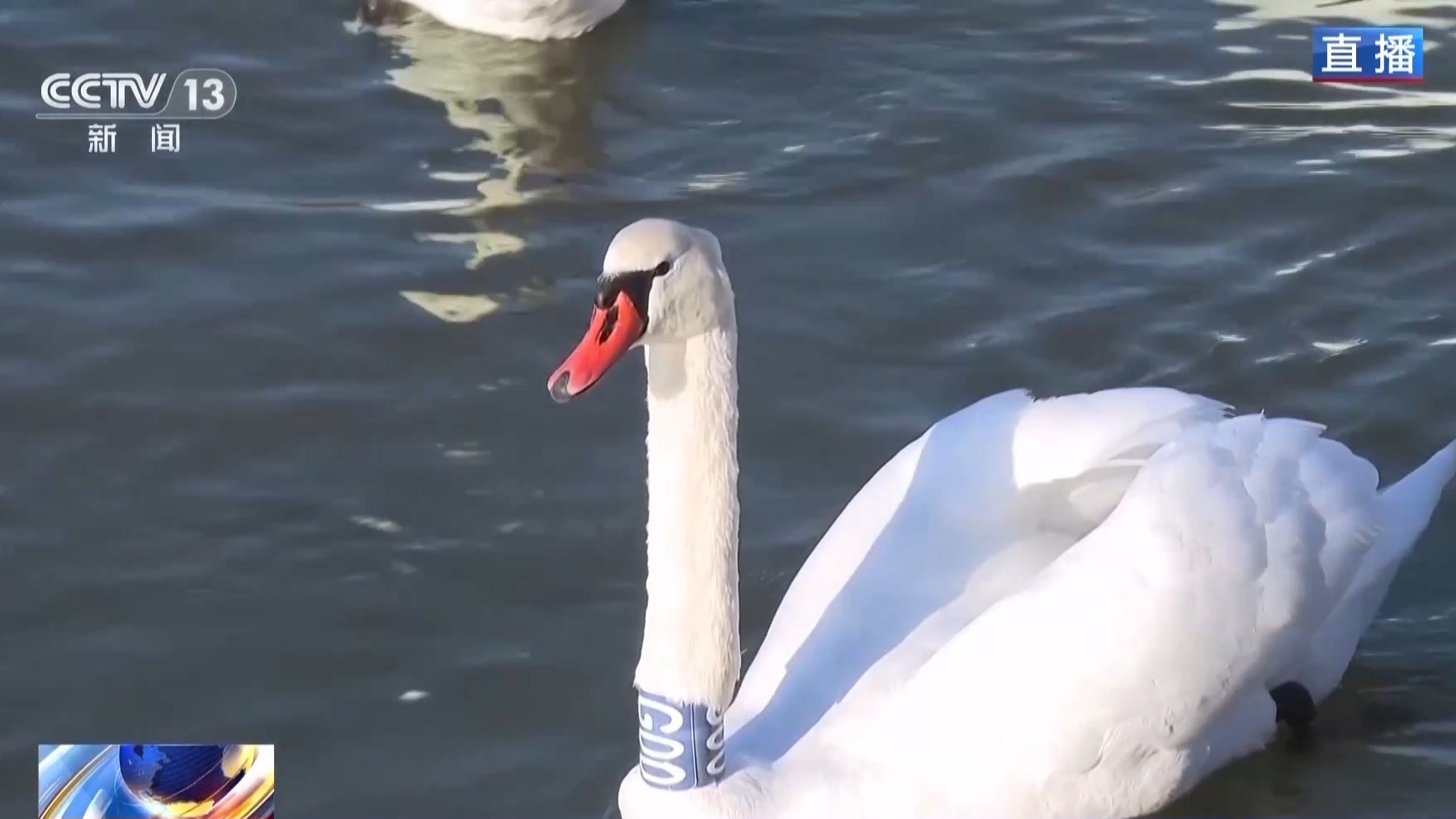 總臺(tái)記者 崔寧:我現(xiàn)在的位置很適合觀察天鵝。這段時(shí)間每天大概有三四十只疣鼻天鵝飛抵天鵝泉。到我們直播前,數(shù)量已經(jīng)達(dá)到了375只,比去年同一時(shí)間多了157只。大批天鵝在一起很熱鬧,而且離我們非常近,根本不怕人。這也讓我們的觀察變得容易很多。疣鼻天鵝最大的特點(diǎn)是它的前額有一塊黑色的瘤狀突起,這也是它的名字——“疣鼻”的來(lái)源。疣鼻天鵝還有一個(gè)特點(diǎn),就是聲帶發(fā)育不同,不像別的天鵝那樣高聲鳴叫,所以也被稱為“啞聲天鵝”。但啞聲并不代表完全沒有聲音。