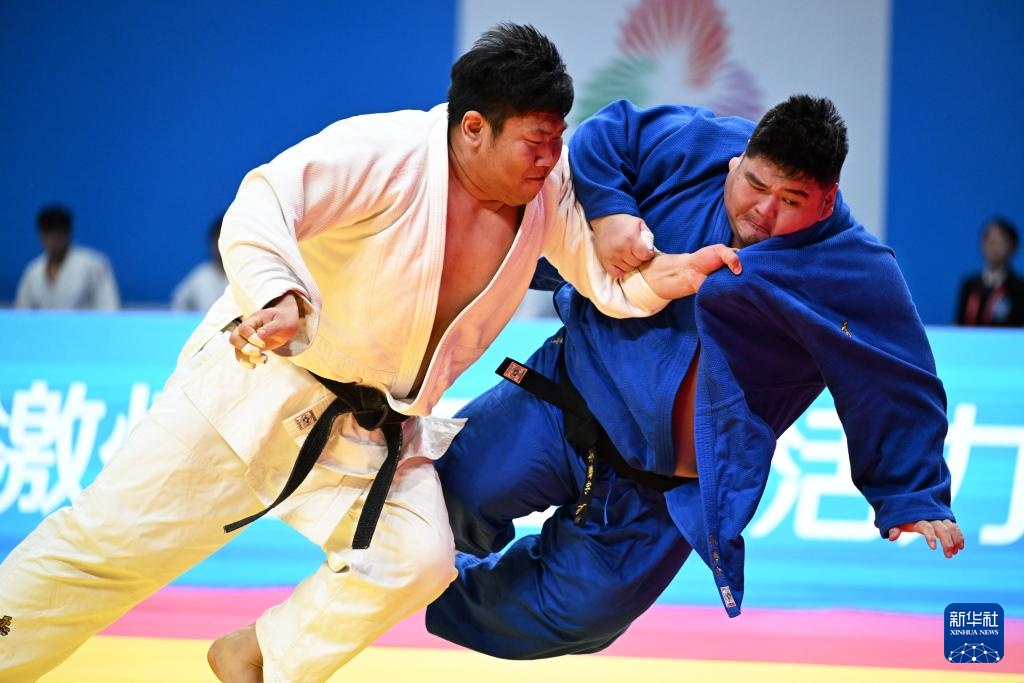 11月13日,山東隊選手原紹童(上)與江蘇隊選手孫騰宇在男子90公斤以上級比賽中。原紹童戰勝孫騰宇。
