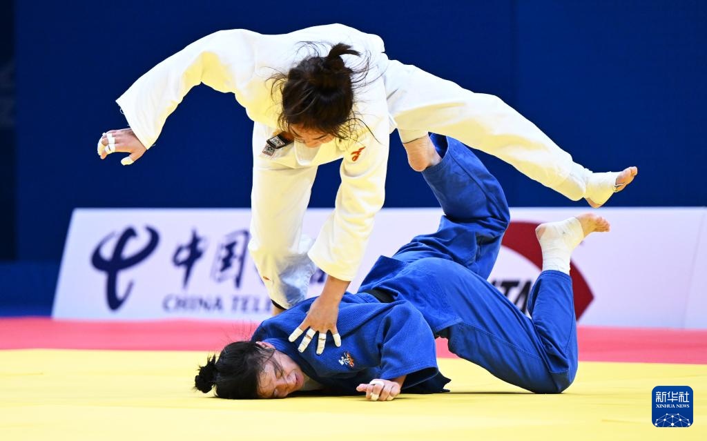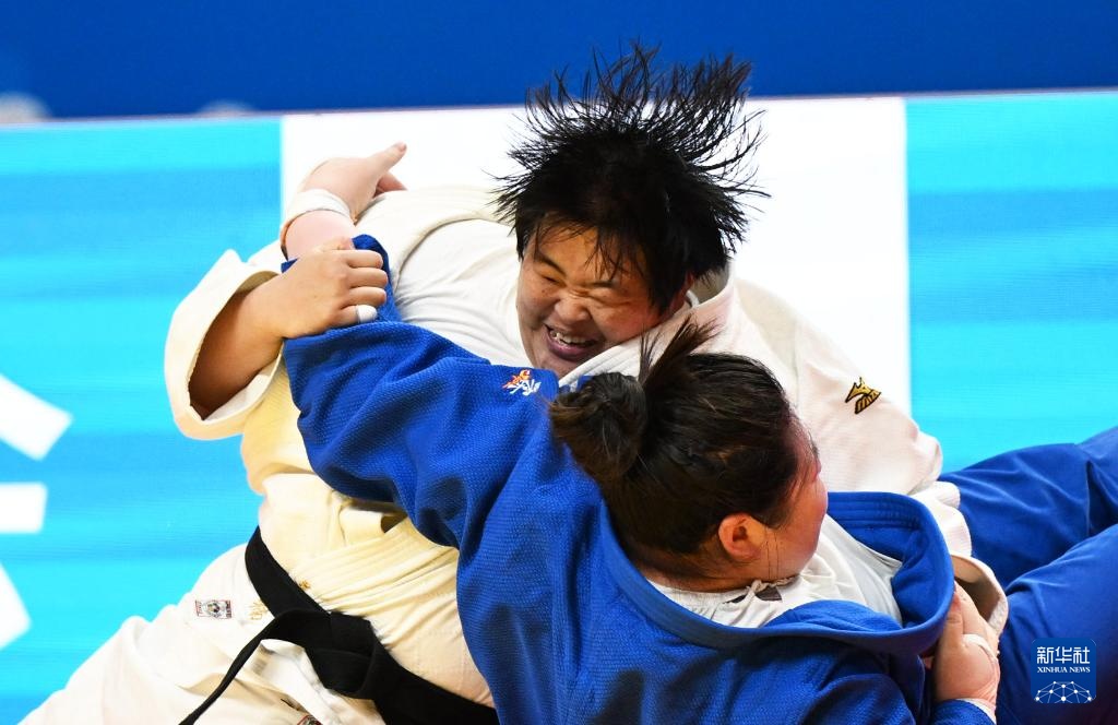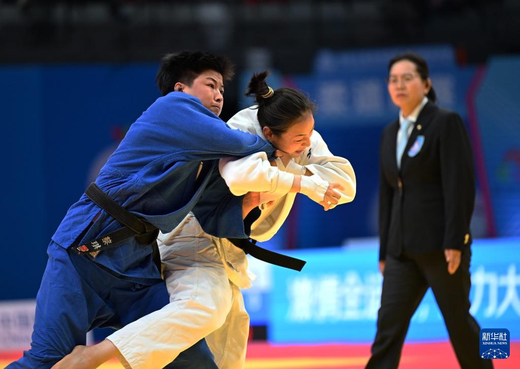 11月13日,山東隊選手姜雅楠(左)與江蘇隊選手徐仕妍在女子70公斤以上級比賽中。姜雅楠戰勝徐仕妍。