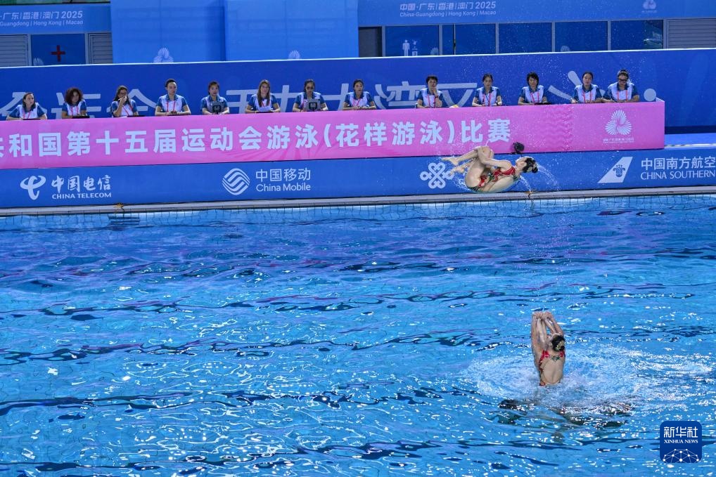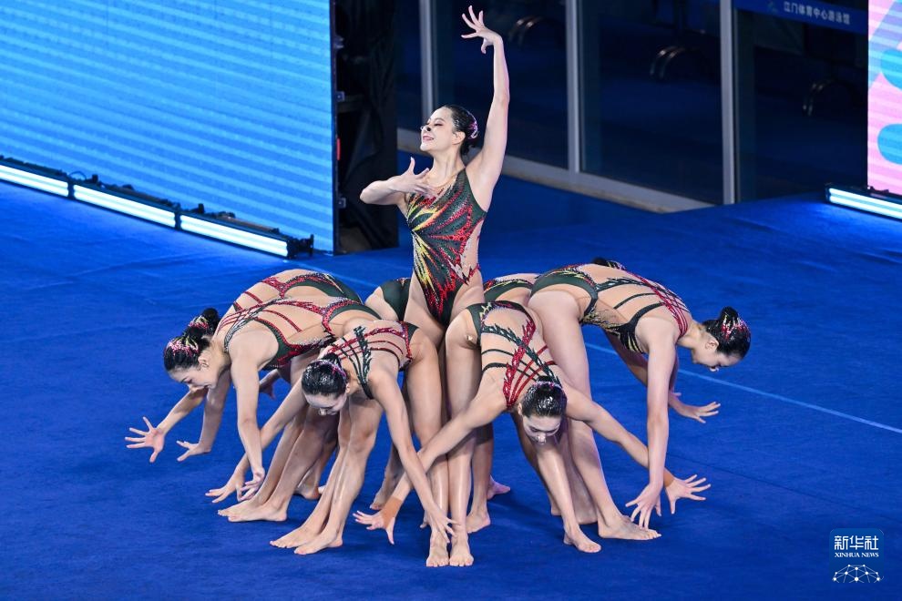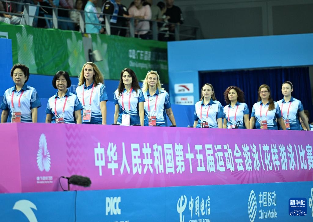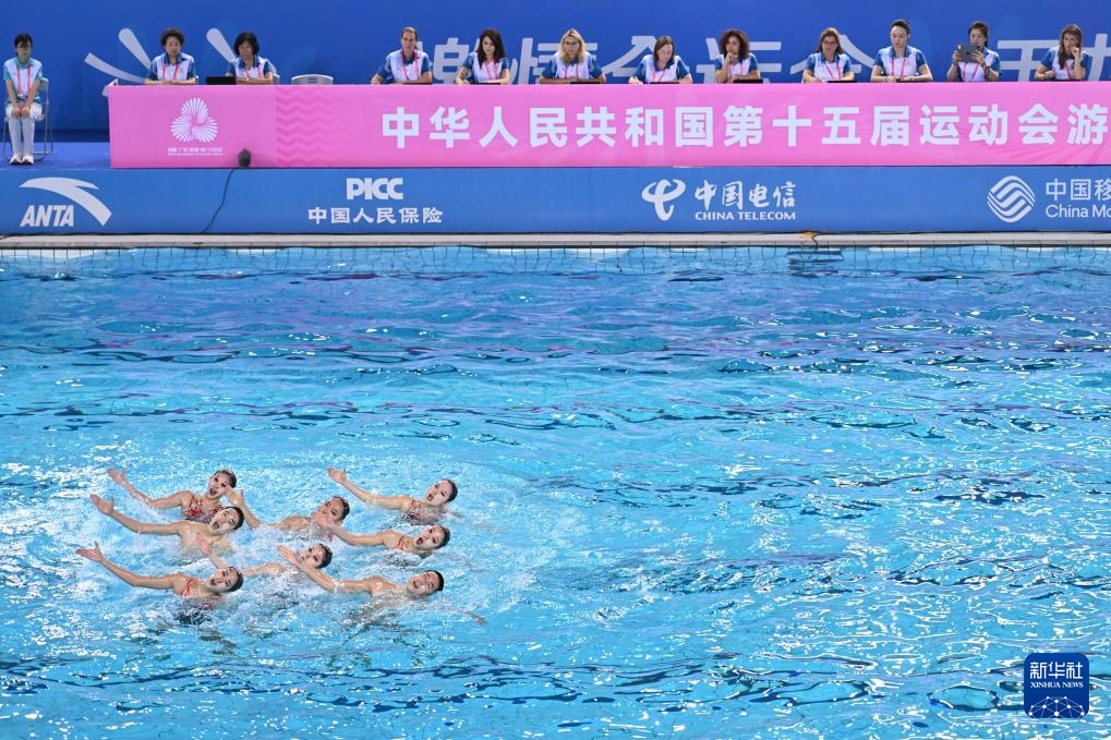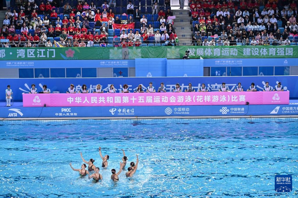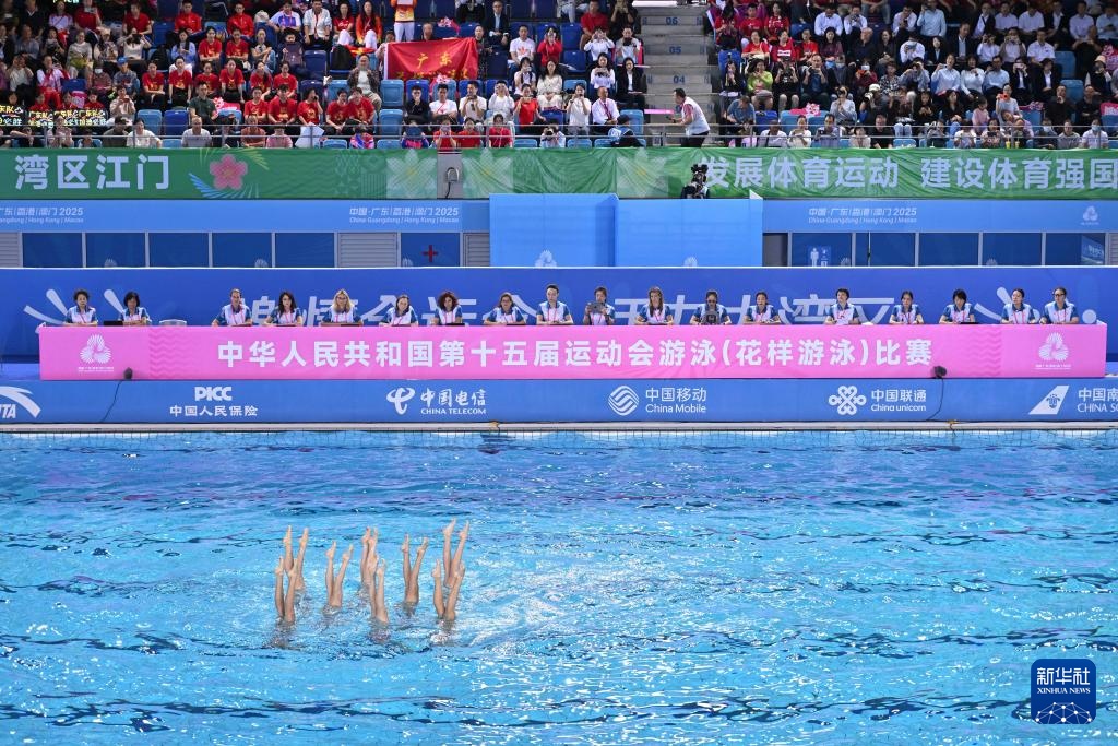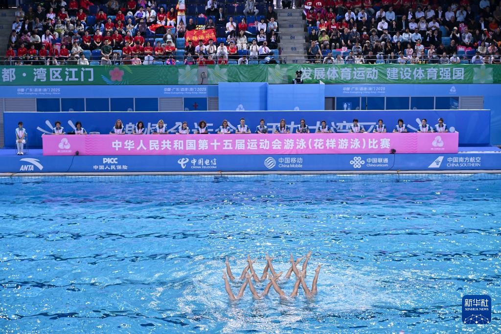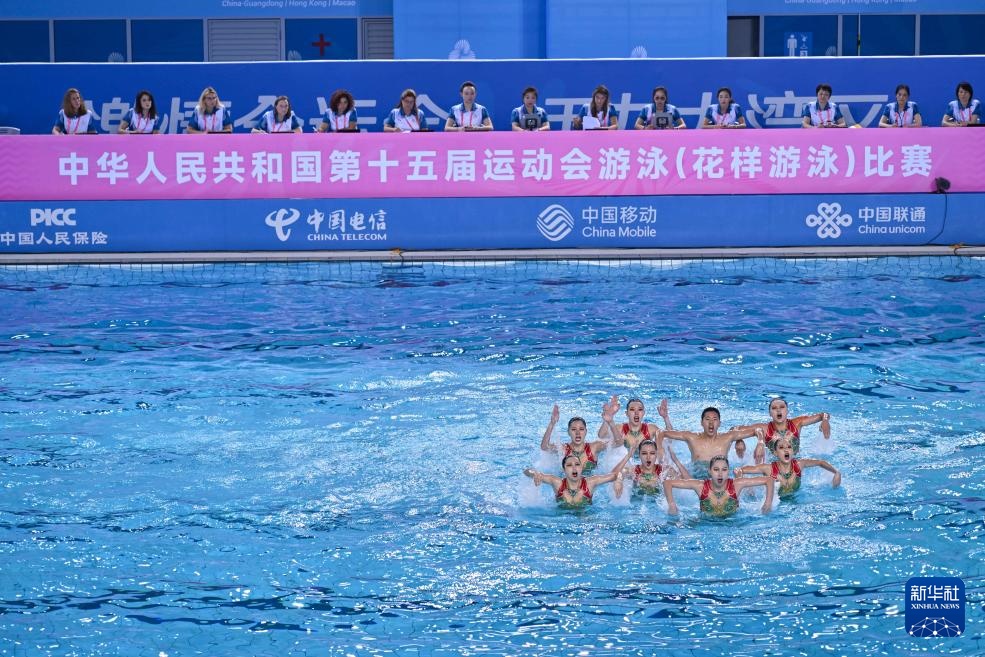 當日,第十五屆全國運動會花樣游泳項目集體技術自選比賽在廣東江門舉行。