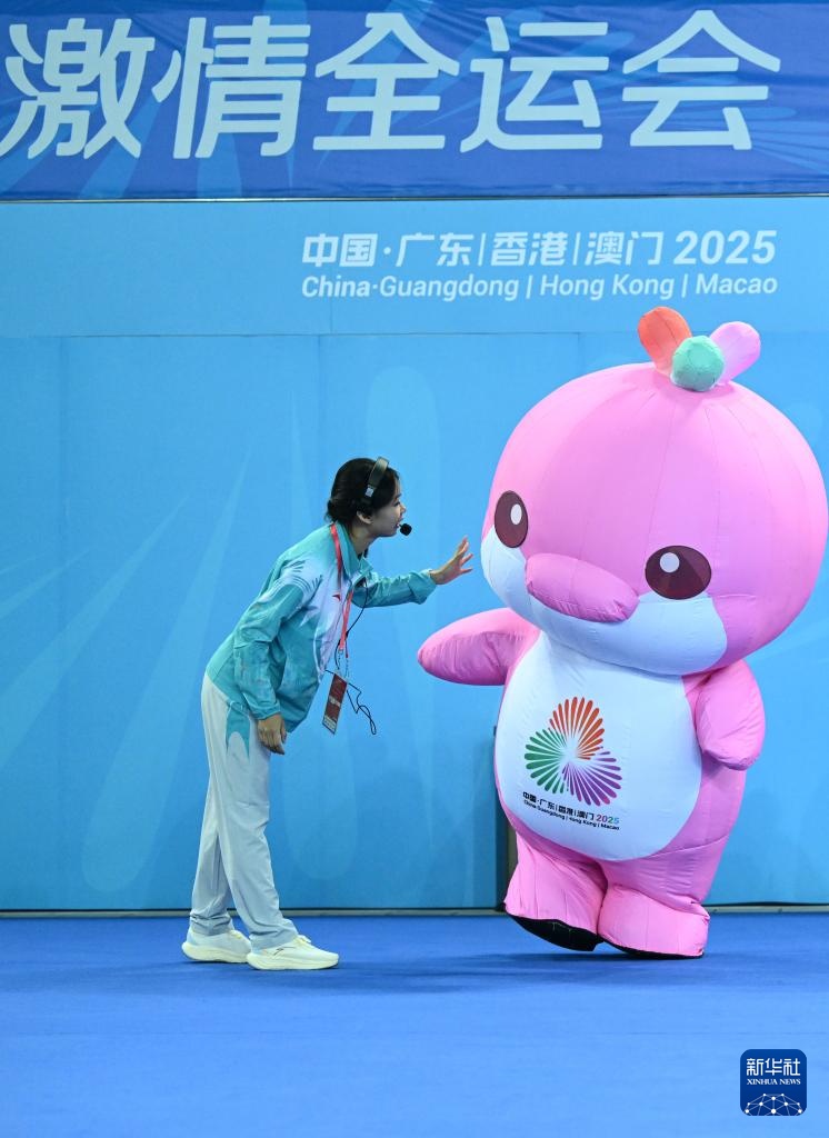11月13日,志愿者在賽前與全運會吉祥物"樂融融"互動。