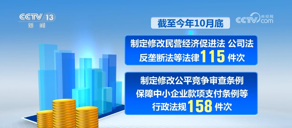 為推進法治化營商環境建設,五年來,我國深入推進科學立法、民主立法、依法立法,切實以高質量立法保障經濟社會高質量發展,截至今年10月底,制定修改民營經濟促進法、公司法、反壟斷法等法律115件次,制定修改公平競爭審查條例、保障中小企業款項支付條例等行政法規158件次。同時,堅持立改廢釋并舉,對全部現行600多部行政法規開展集中清理,統籌開展涉企不平等政策和法律法規清理,為建設統一大市場、推動高質量發展提供了重要保障和支撐。