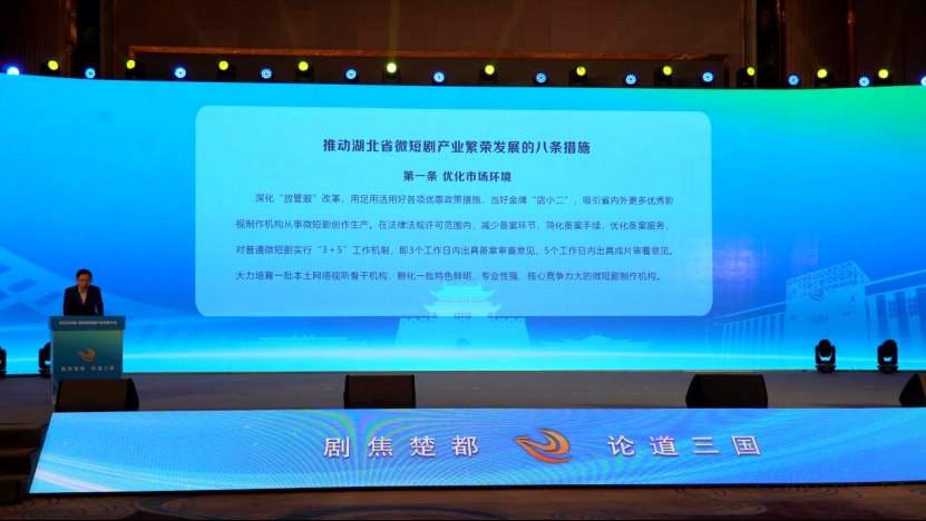 會上,高長力圍繞網絡視聽產業發展狀況作分享,省廣播電視局黨組成員、副局長汪長君發布湖北省微短劇產業扶持政策。