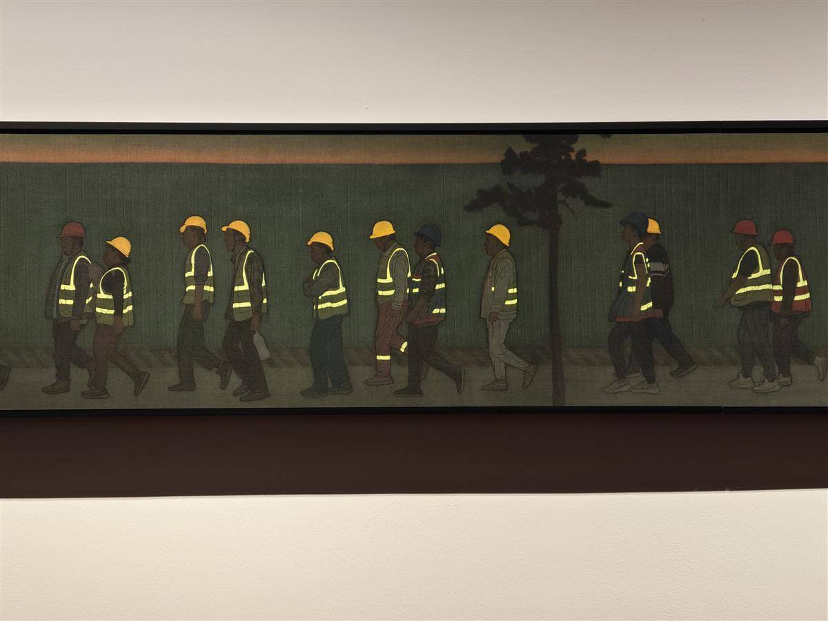 水墨與時代的接軌,也體現在藝術家以水墨藝術為載體,對人們現實生活進行書寫和表達。在武漢美術館(漢口館)的2號展廳里,一幅長達8.6米的絹本工筆畫占據了一整面展墻,令人矚目。這幅畫的作者是中國藝術研究院的國畫院副院長李傳真,她是一名湖北籍畫家,她專注于以農民工為題材的現實主義工筆人物畫創作,而這幅名為《晨昏線No.2》的作品就用傳統工筆畫法描繪了工人們在天光未明之時的混沌狀態。