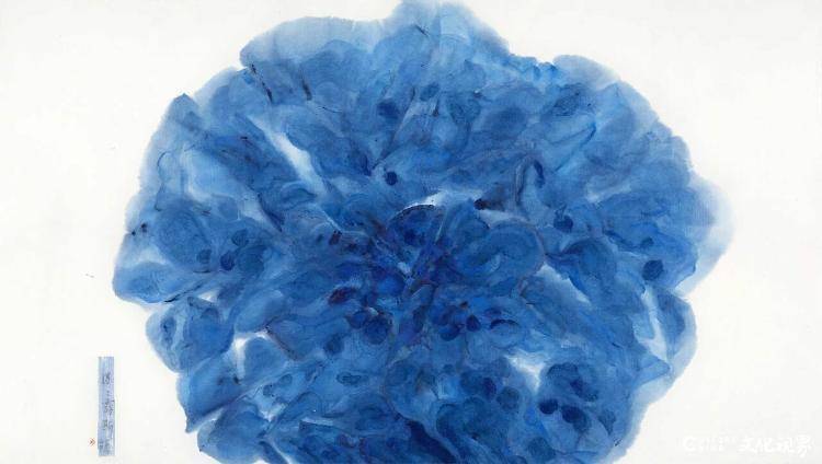 堅守傳統的同時必須與時代審美接軌,這是湖北美術學院原院長徐勇民對水墨藝術的看法。在“時代·筆墨”展的現場,徐勇民向記者介紹了他的水墨作品《湛湛露斯》。這幅作品創作于2016年,題名取自《詩經》中的原句,是他的“大藍花”系列作品之一。“所謂‘一花一世界’,看到這幅作品,能從微觀的形態當中感受到更多世界跟宇宙的變化,我覺得這是中國文化給予我的一種啟示。”