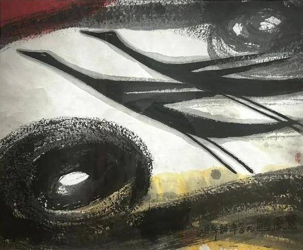 武漢美術館的“水墨文章”展覽就展出了一幅周韶華于1990年創作的《楚風圖》,畫中的主體是兩只墨色的鳳鳥相依相伴,周圍的流云自在地飄拂,呈現出云卷云舒的意境。策展人荊菲介紹:“包括這幅《楚風圖》在內的一批作品,周韶華先生都是從傳統繪畫里借用楚文化等元素,通過對這些元素的加工和轉換,來進行當代水墨的創作。”