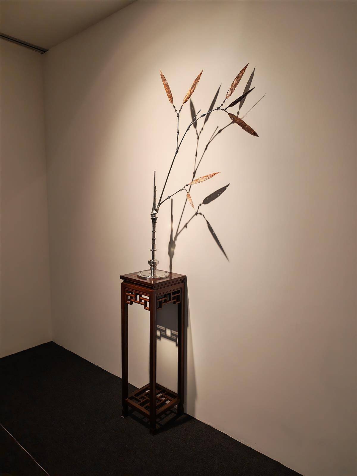 除了前面介紹的《千里江山》《山水譜》,還有許多作品都脫離了傳統水墨的框架,聚焦于水墨精神的表達。雕塑藝術家史金淞創作的《未來詩學研究·竹譜》是一件特別的作品,他以傳統中國畫中的“竹譜”為線索,呈現出傳統中象征君子風骨、清雅柔韌的翠竹形象。在燈光的映照下,竹枝的影子投射在墻壁上,傳統的水墨元素被充滿科技感和空間感的光影美學巧妙表達,別具意蘊。