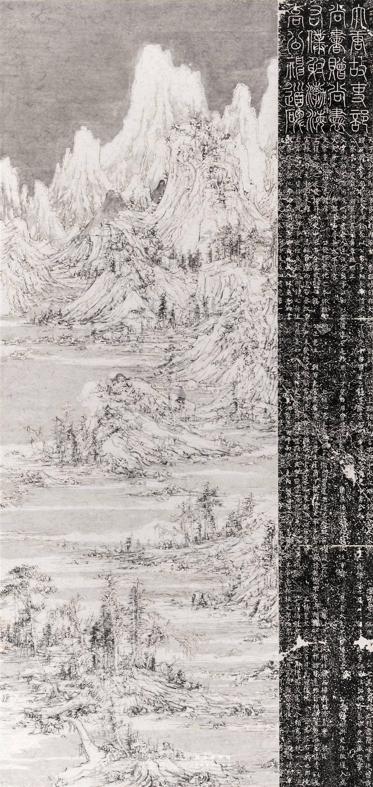 復旦大學教授王天德于2019年創作的《佘山抱水圖》更是把水墨創作玩出了花樣。這件在武漢美術館(漢口館)展出的作品右側植入了清代拓片柳公權《高元裕碑》,用香燙的形式將山水與宣紙層層疊加,第一層畫在畫好后用香燙出痕跡,第二層畫則透過香燙的孔洞展現出來,最后呈現出的是兩層疊加的畫面。山水圖式與古代碑拓、墨跡相置,既反映了中國傳統的審美特征,又產生了不同于傳統的新鮮表達。