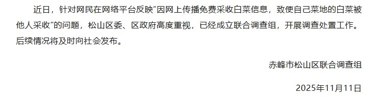 11日晚,赤峰市松山區發布情況通報,稱針對網民在網絡平臺反映“因網上傳播免費采收白菜信息,致使自己菜地的白菜被他人采收”的問題,松山區委、區政府高度重視,已經成立聯合調查組,開展調查處置工作,后續情況將及時向社會發布。