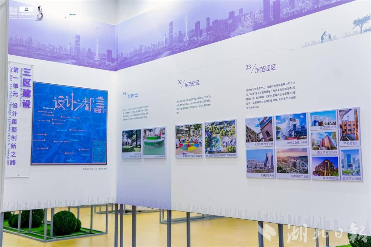 展覽圍繞“示范園區—示范街區—創意社區”三大板塊系統展開。用“設計集聚創新之路”回顧了武漢自2020年啟動的“三區建設”歷程。